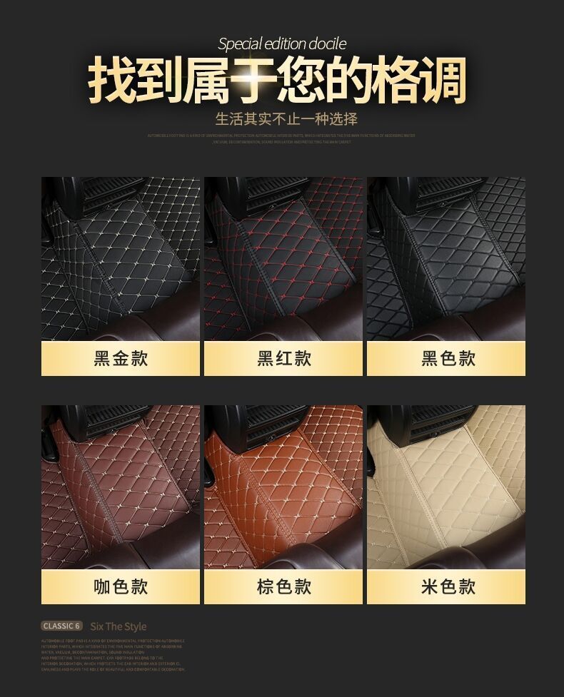 颜色 黑红皮革五座单层,黑米皮革五座单层,黑色皮革五座单层,咖色皮革五座单层,米色皮革五座单层,双层款黑米皮革+灰色地毯垫,双层款黑色皮革+黑色地毯垫,双层款黑红皮革+红色地毯垫,双层款咖色皮革+咖色地毯垫,双层款米色皮革+米粽地毯垫,单层款主驾驶单片-黑米皮革,单层款主驾驶单片-黑红皮革,单层款主驾驶单片-黑色皮革