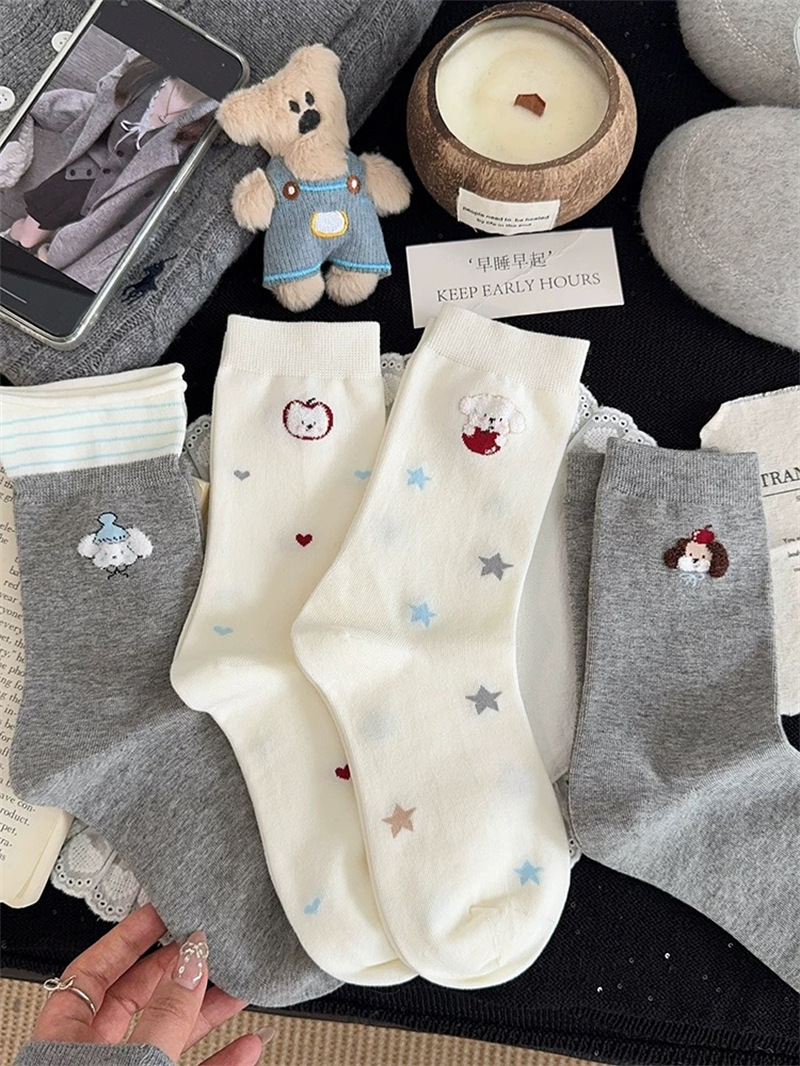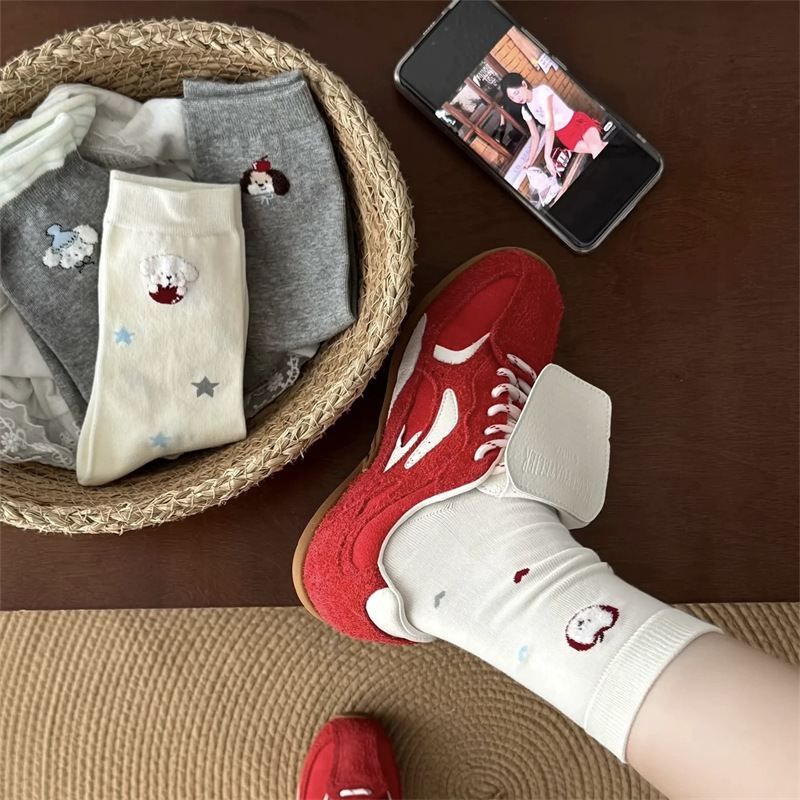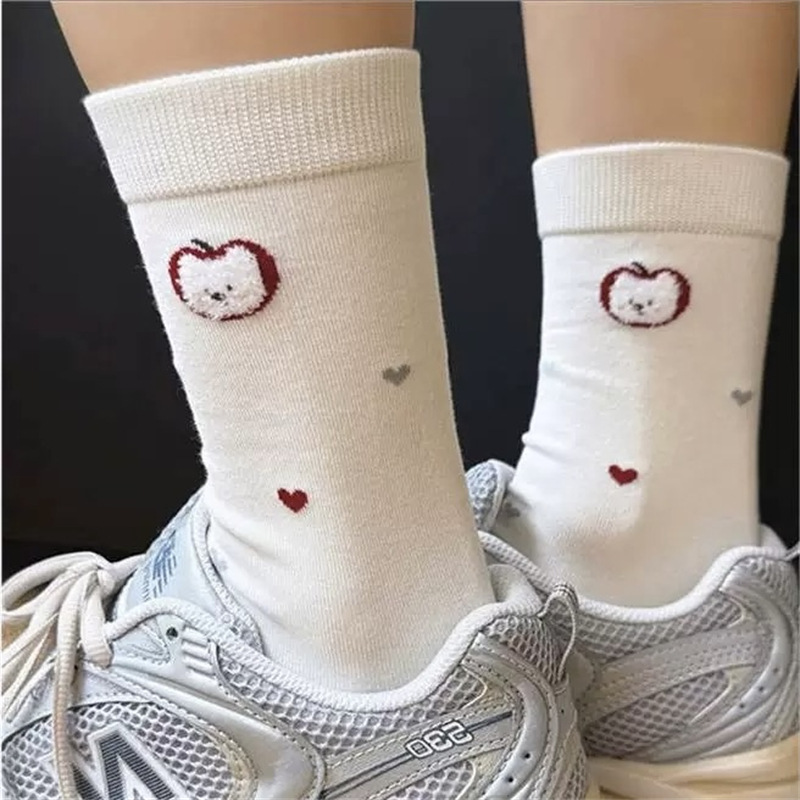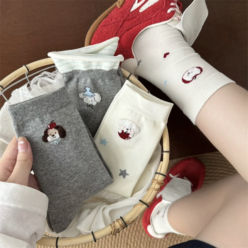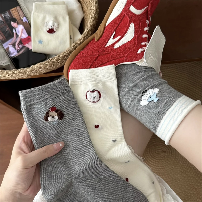 可爱袜子女纯棉白色苹果小狗中筒袜ins潮日系卡通学院风长袜秋天