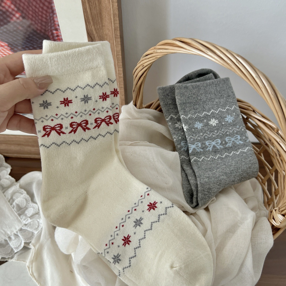 秋冬新款费尔岛中筒袜子女白色蝴蝶结爱心卷边棉袜韩系配勃肯鞋袜