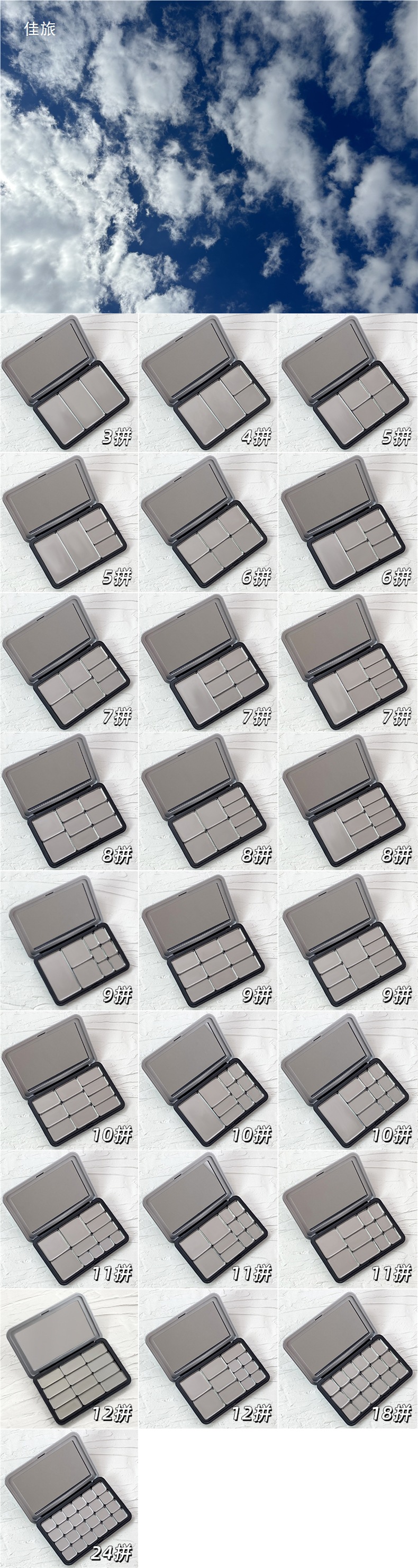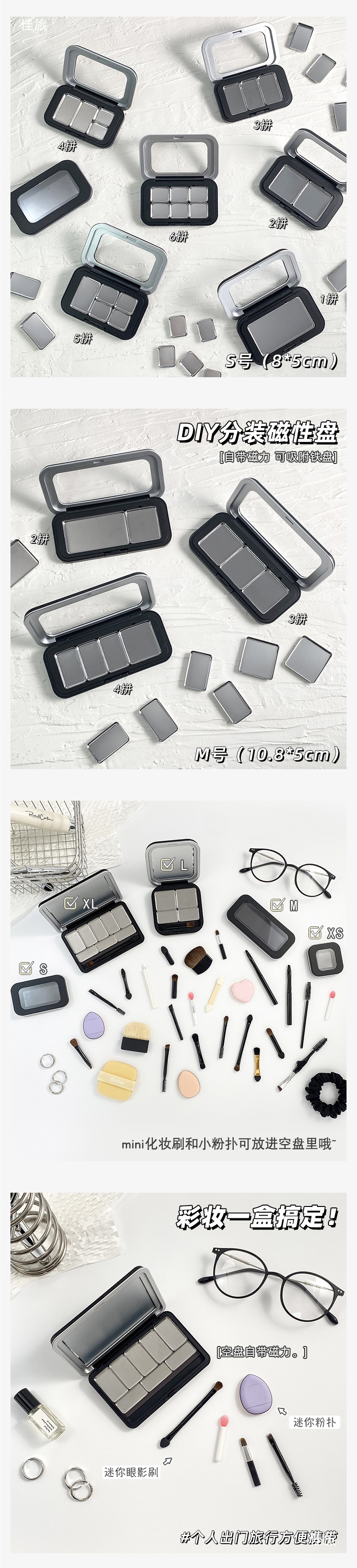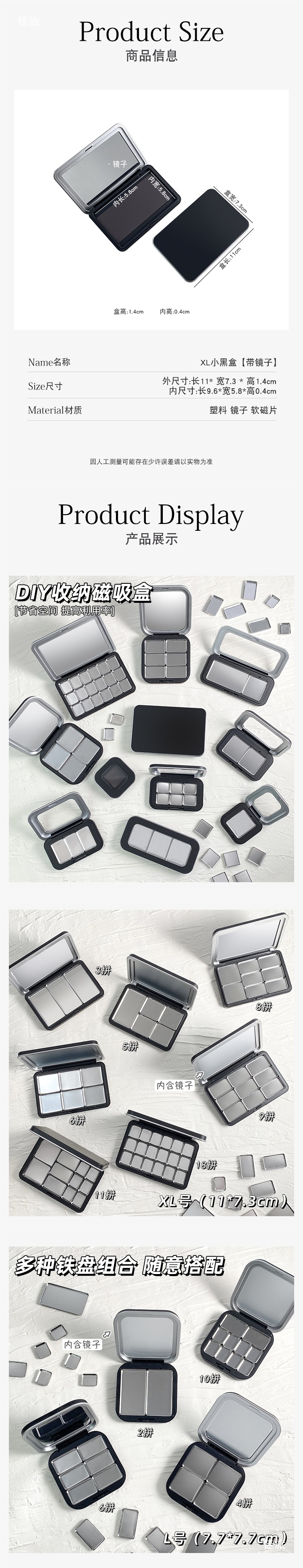 无~XL小黑盒+镜子 79克,3拼XL小黑盒送3个铁盘+1个压粉模块+分装勺A*3,4拼XL小黑盒送4个铁盘+2个压粉模块+分装勺A*2+B*2,5拼XL小黑盒送5个铁盘+2个压粉模块+分装勺A*2+C*3,5拼—XL小黑盒送5个铁盘+2个压粉模块+分装勺A*1+B*4,6拼XL小黑盒送6个铁盘+1个压粉模块+分装勺B*6,6拼XL小黑盒送6个铁盘+3个压粉模块+分装勺A*1+B*2+C*3,7拼XL小黑盒送7个铁盘+2个压粉模块+分装勺B*4+C*3,7拼~XL小黑盒送7个铁盘+2个压粉模块+分装勺A*1+C*6,7拼~~XL小黑盒送7个铁盘+3个压粉模块+分装勺A*1+B*2+D*4,8拼XL小黑盒送8个铁盘+2个压粉模块+分装勺B*2+C*6,8拼~XL小黑盒送8个铁盘+2个压粉模块+分装勺B*4+D*4,8拼~~XL小黑盒送8个铁盘+3个压粉模块+分装勺A*1+C*3+D*4,9拼XL小黑盒送9个铁盘+1个压粉模块+分装勺C*9,9拼~XL小黑盒送9个铁盘+3个压粉模块+分装勺A*1+B*2+E*6,9拼~~XL小黑盒送9个铁盘+3个压粉模块+分装勺B*2+C*3+D*4,10拼XL小黑盒送10个铁盘+3个压粉模块+分装勺A*1+C*3+E*6,10拼~XL小黑盒送10个铁盘+4个压粉模块+分装勺A*1+B*1+D*2+E*6,10拼~~XL小黑盒送10个铁盘+2个压粉模块+分装勺C*6+D*4,11拼XL小黑盒送11个铁盘+3个压粉模块+分装勺B*2+C*3+E*6,11拼~XL小黑盒送11个铁盘+3个压粉模块+分装勺B*3+D*2+E*6,11拼~~XL小黑盒送11个铁盘+3个压粉模块+分装勺B*3+D*4+F*4,12拼XL小黑盒送12个铁盘+1个压粉模块+分装勺D*12,12拼—XL小黑盒送12个铁盘+4个压粉模块+分装勺B*2+C*3+D*1+F*6,18拼XL小黑盒送18个铁盘+1个压粉模块+分装勺E*18,24拼XL小黑盒送24个铁盘+1个压粉模块+分装勺F*24,XS小黑盒—透明亚克力天窗15克1个引磁铁片+扣盘翘片,S小黑盒—透明亚克力天窗24克10个引磁铁片+扣盘翘片,M小黑盒—透明亚克力天窗34克10个引磁铁片+扣盘翘片,L小黑盒+镜子48克10个引磁铁片+扣盘翘片,磁吸粉饼小黑盒+镜子送59mm直径圆铁盘,XL小黑盒+镜子79克10个引磁铁片+扣盘翘片,小号双层空盘159克30个引磁铁片+扣盘翘片2件套,大号双层磁吸空盘290克40个引磁铁片+扣盘翘片2件套,压盘工具6件套垫纸+酒精片+分装勺+平铲+橡胶锤+研磨器,压盘工具7件套垫纸+酒精片+分装勺+平铲+橡胶锤+陶瓷研钵+筛子清洗方便,马毛眼影刷三支装晕染/扫粉研磨工具清扫余粉哦~,加热杯垫扣盘 重力感应开关膏体分装,扣盘工具套装加热杯垫+尖头铲+勾刀+粉刺针+翘片+酒精棉片+工具盒,膏体分装工具套装加热杯垫.+分装勺+烧杯+玻璃搅拌棒+指套+酒精棉片,酒精棉片1盒100片,usb充电研磨器粉碎,防粘垫纸6张压粉/隔离 装粉减少挂壁,撬片两件套,粉刺针8.2cm扣盘,迷你筛子筛粉/过滤,黑色橡胶木锤180g,风油精3ml1瓶,热风枪加热熔胶,电烙铁扣盘 战无不胜,玻璃烧杯10ml熔膏体,圆头玻璃棒搅拌/研磨,胶水7ml彩妆脱盘固定,电子秤500g/0.01分装 +2节电池,扣盘6件餐尖头铲+勾刀+粉刺针+翘片+酒精棉片+工具盒扣盘前先加热彩妆盘,压粉布13cm*100cm建议一色一布