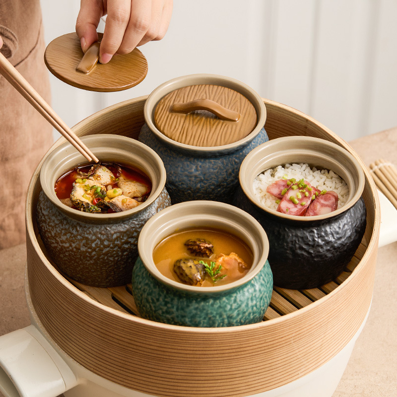 工場製の岩模様の陶器のシチューポット、一人用スープポット、シングルポットの豚カルビと黒鶏のスープポット、健康スープ、陶器の蒸し卵カップ