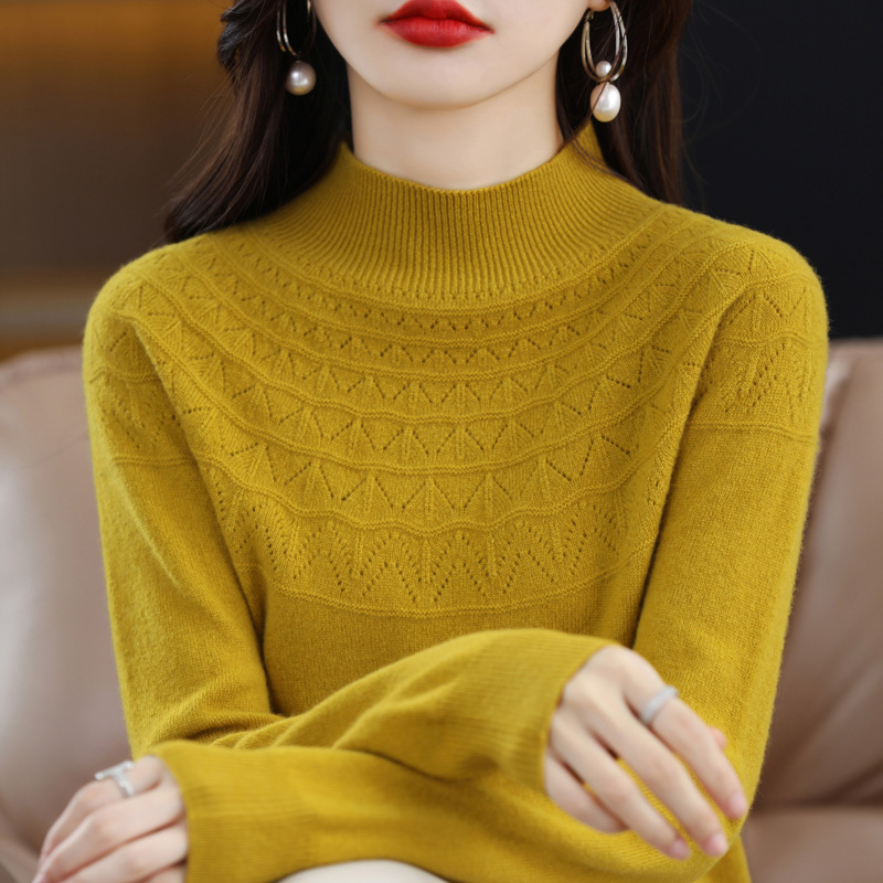 半身透かし彫りウールセーター レディース 2024秋冬 ハーフハイネックウールセーター 女性用ファインウール ルーズフィット