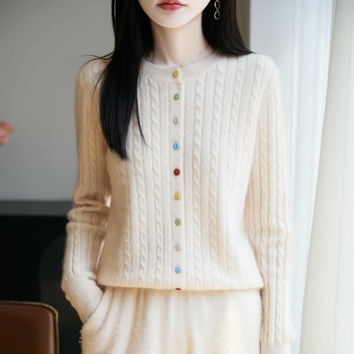 秋冬100纯羊毛衫开衫女彩色扣麻花针织衫圆领慵懒风毛衣外套上衣