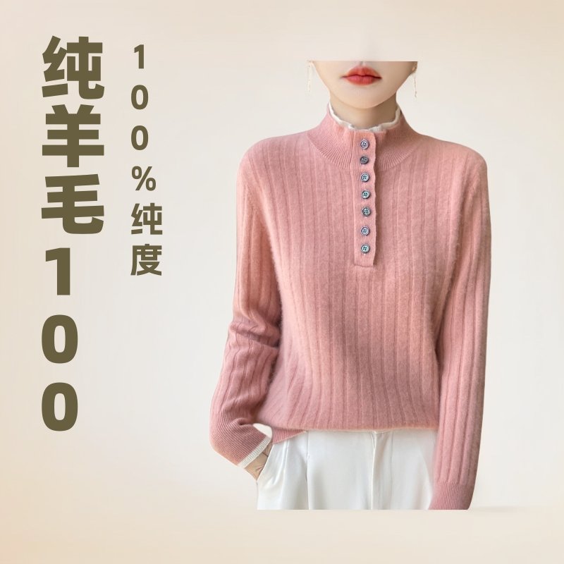 100%纯羊毛2025秋冬新女宽松半高领撞色双层领纽扣内搭针织衫毛衣