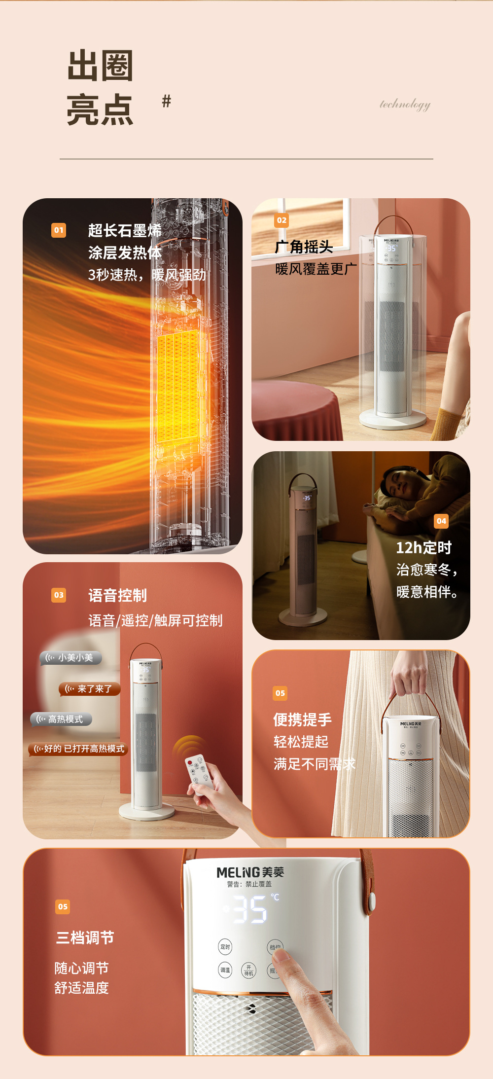 ヒーター、温風機、電気ヒーター、タワー型電気ヒーター、急速加熱、首振り、タイマー、音声制御、グラフェン