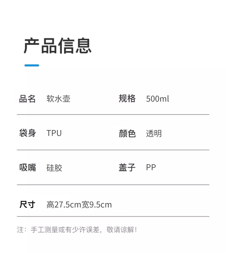 运动软水壶便携折叠500ml户外软水袋 跨境登山越野可折叠跑步水壶