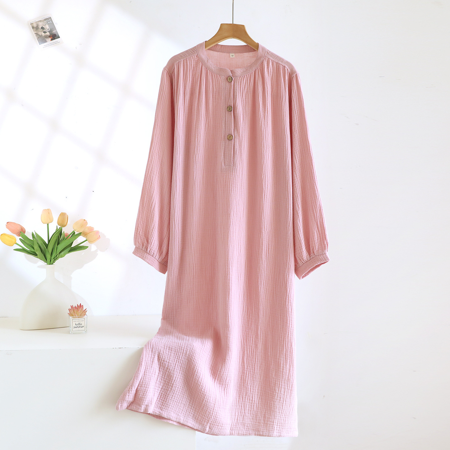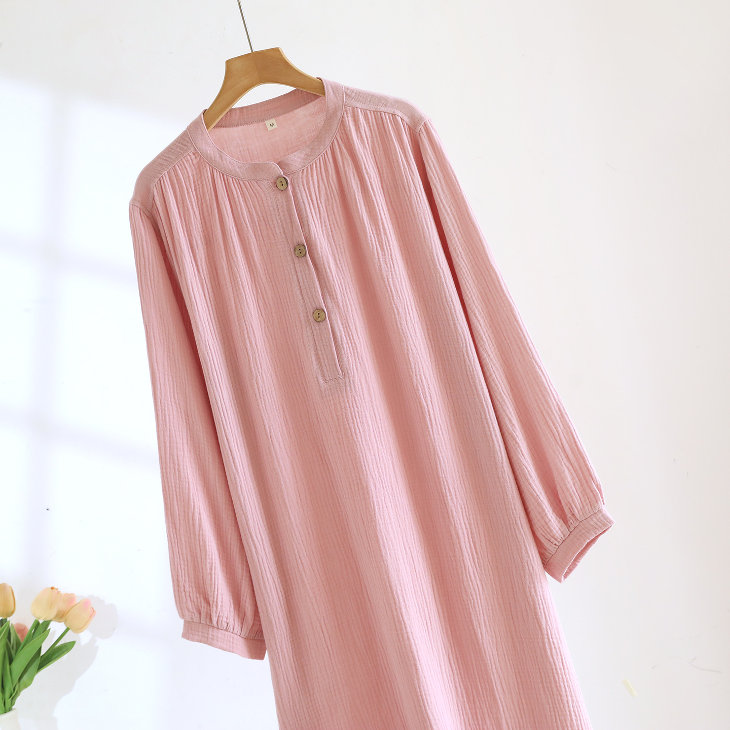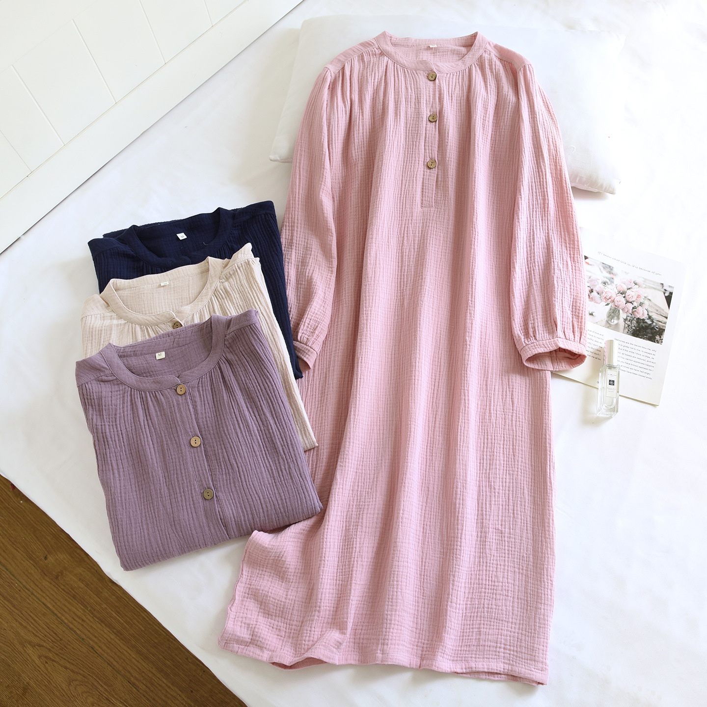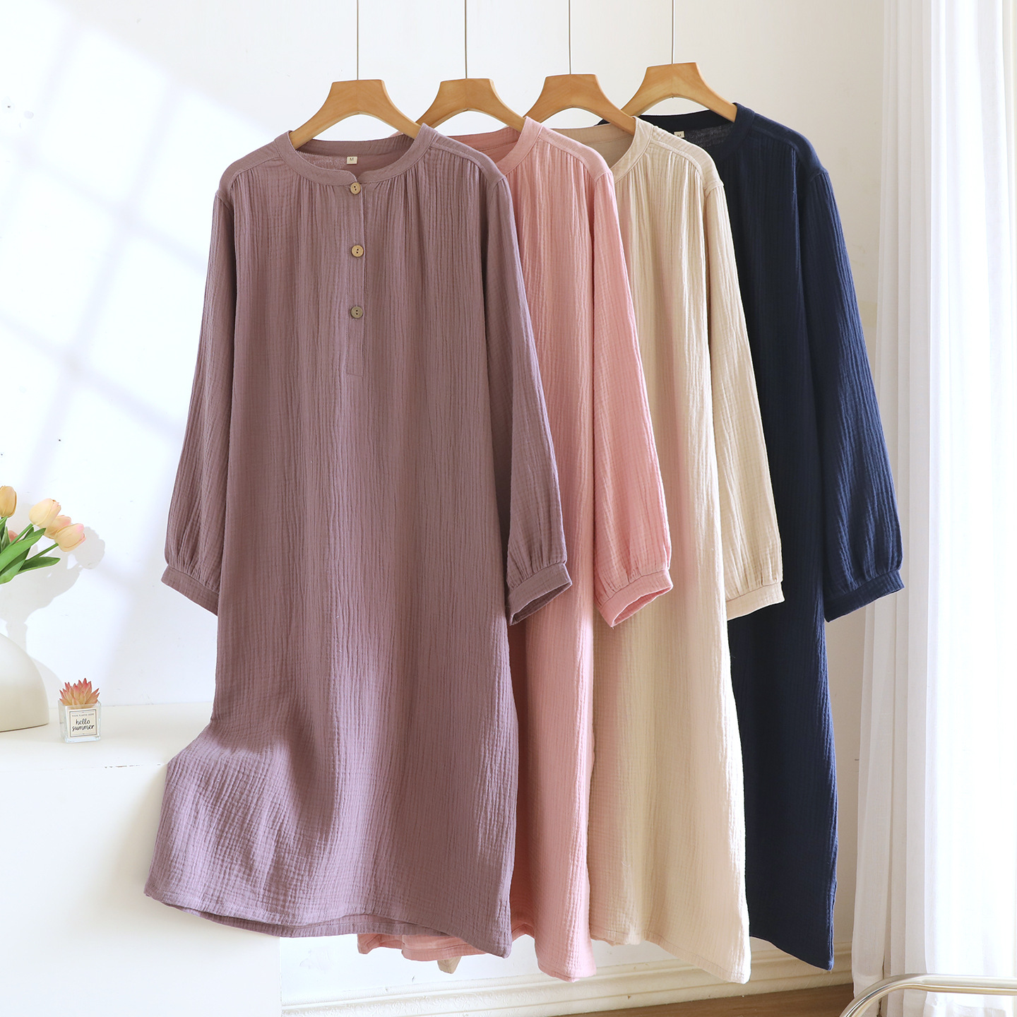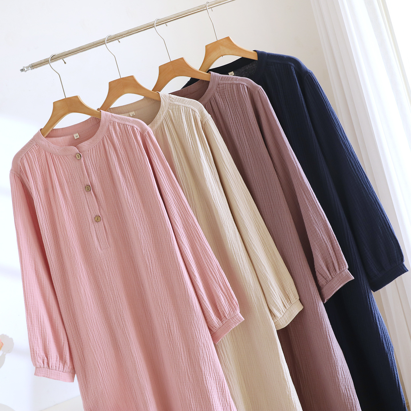 ちりめん純綿パジャマ春夏秋ミディアムロング長袖二重ガーゼコットンレディースワンピースホームウェアパジャマ