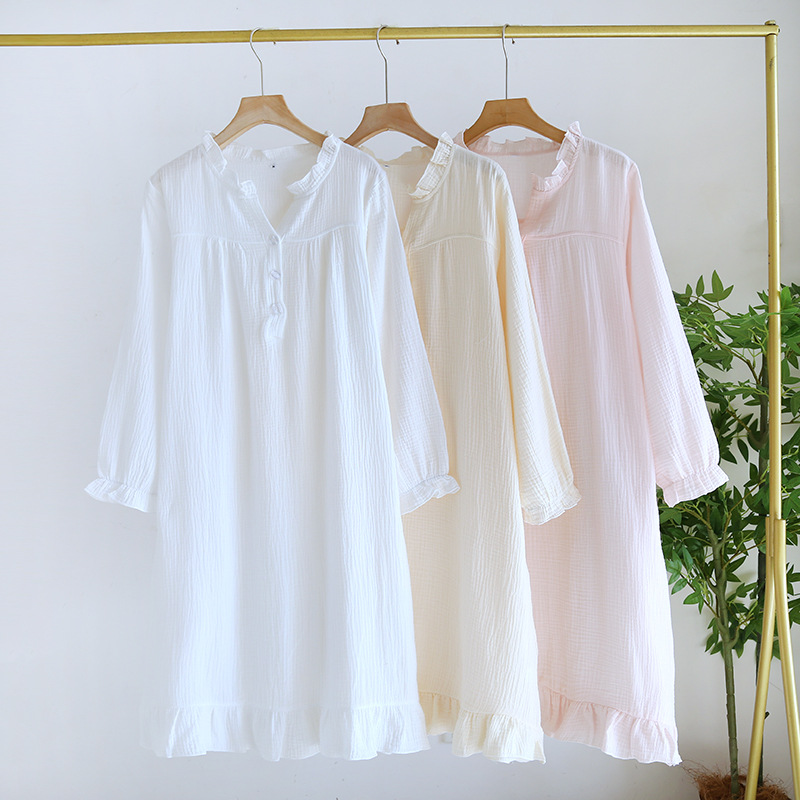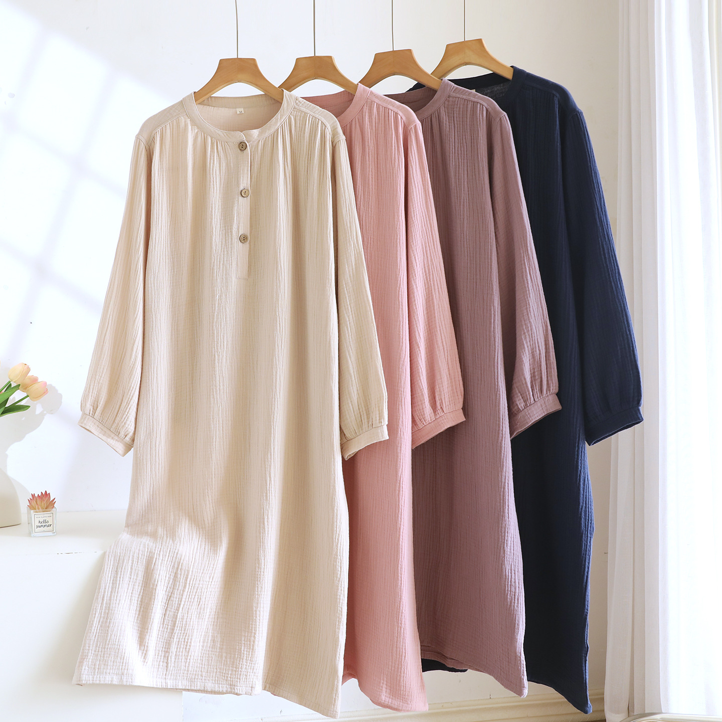女性用綿ガーゼナイトガウン、しわ加工コットン二重ガーゼ長袖新作パジャマ、純綿大きいサイズワンピース、ホームウェア