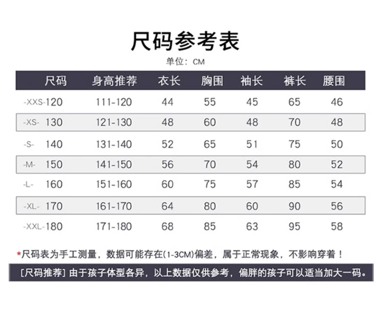 尺码 120 【推荐110-120CM、30-45斤】,130 【推荐120-130CM、45-55斤】,140 【推荐130-140CM、55-70斤】,150 【推荐140-150CM、70-80斤】,160 【推荐150-160CM、80-90斤】,170 【推荐160-170cm90-110斤】,180 【推荐170-180cm110-130斤】