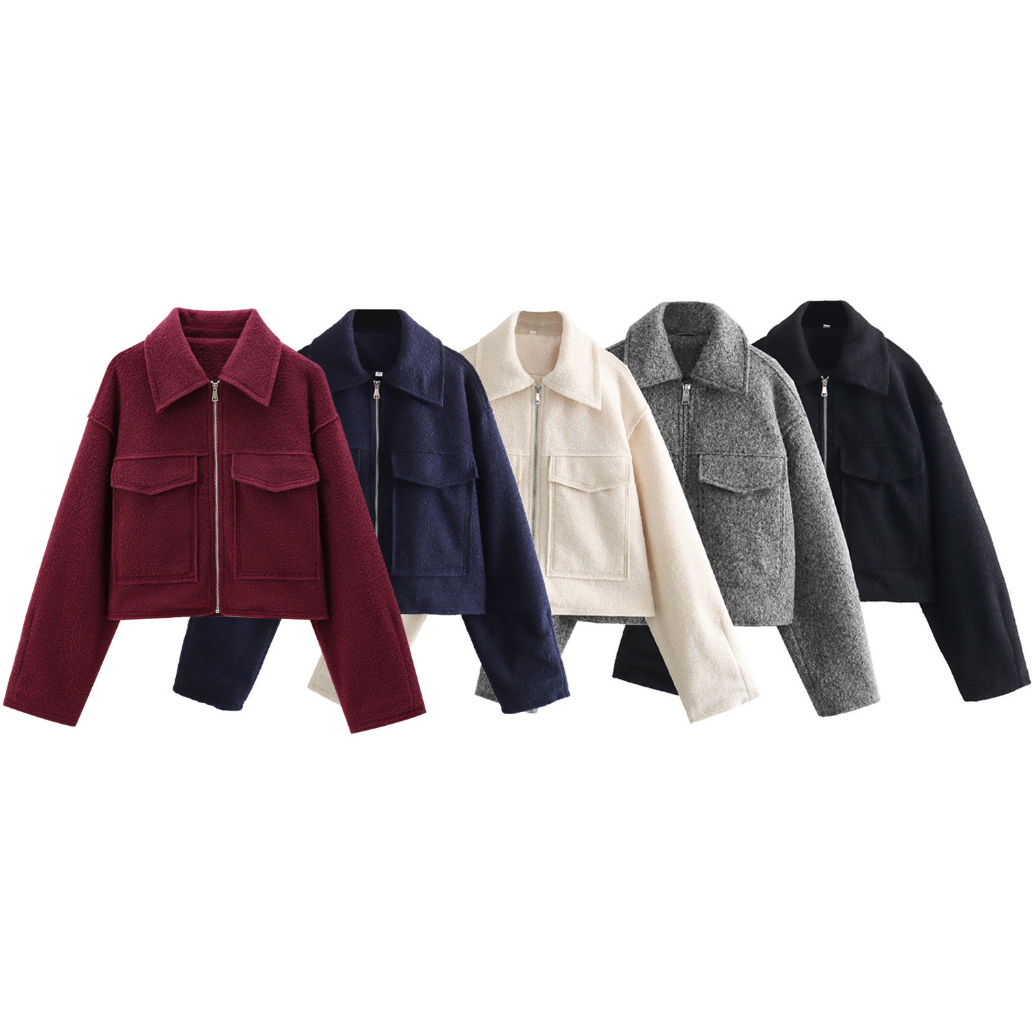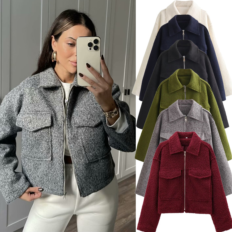 2025秋季时尚三色纯色阔型拉链毛呢外套跨境亚马逊女装B88780