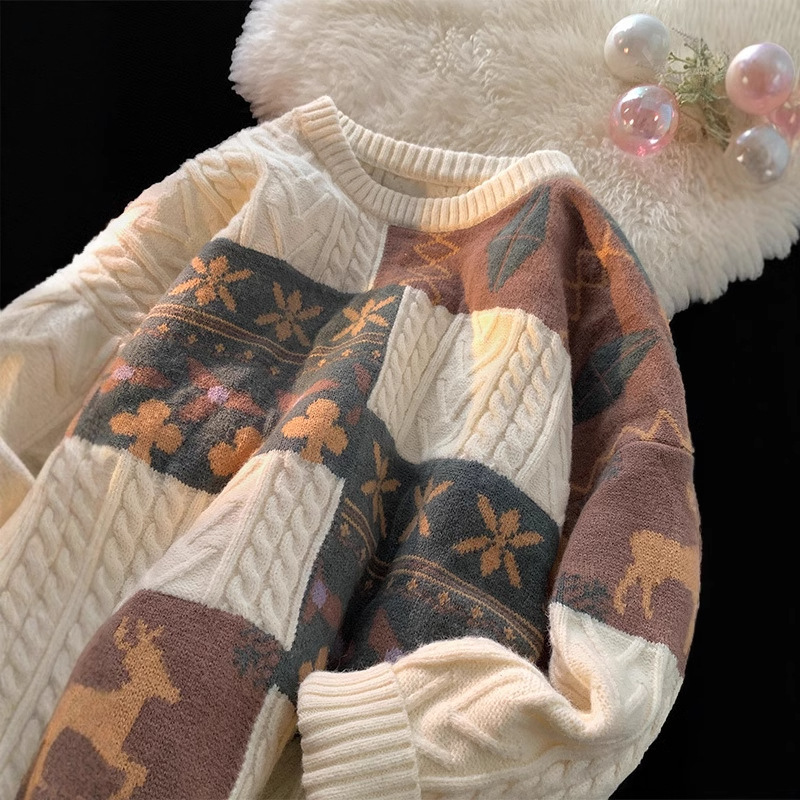 撞色条纹圆领毛衣男款冬季加厚保暖青少年情侣装针织衫慵懒风线衣