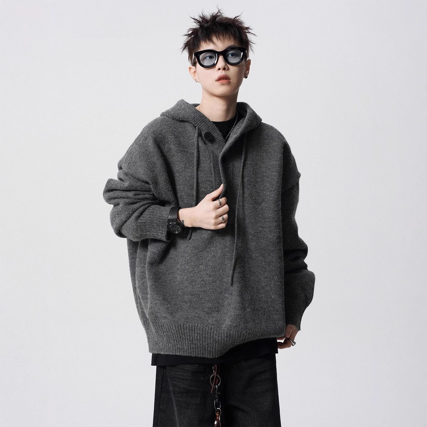 高街纯色连帽针织衫男款冬季美式cleanfit连帽卫衣感痞帅毛衣男