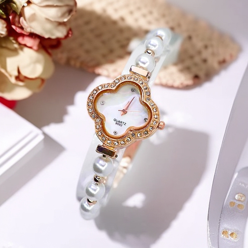 国境を越えたライブブロードキャスト人気の四つ葉のクローバーダイヤモンドファッションレディースウォッチプルアウト女子学生パールブレスレットウォッチ卸売