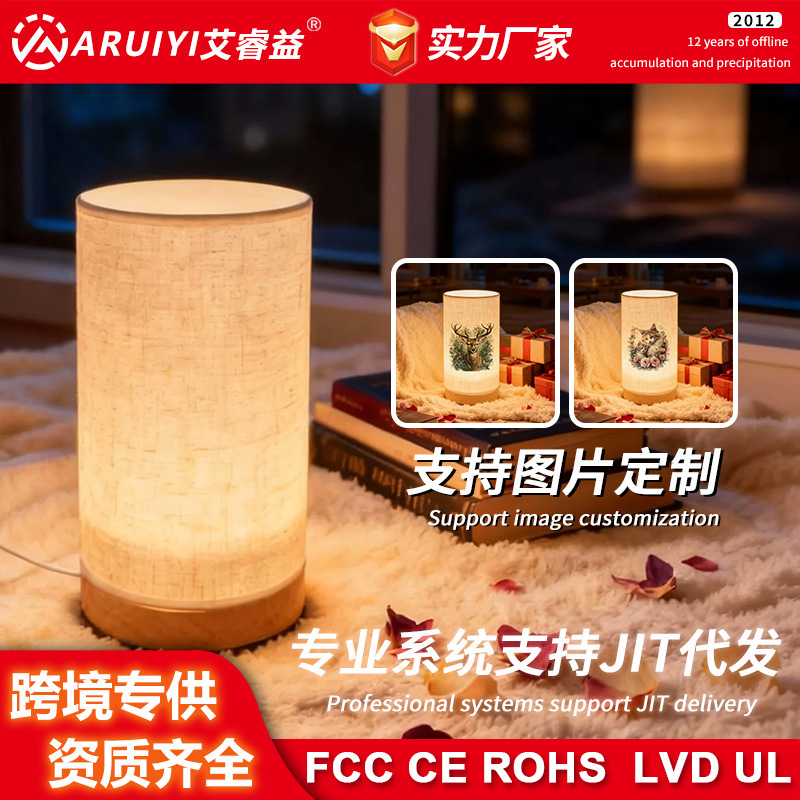 跨境爆款布艺实木台灯书房卧室睡眠USB床头灯氛围可定制印花夜灯
