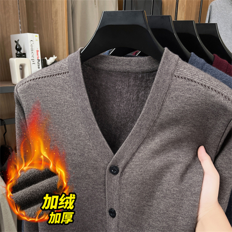 跨境专供冬季新款休闲加绒加厚男士针织长袖V领毛衣开衫外套批发