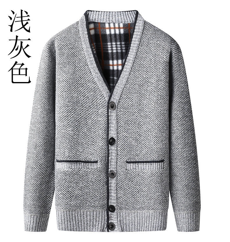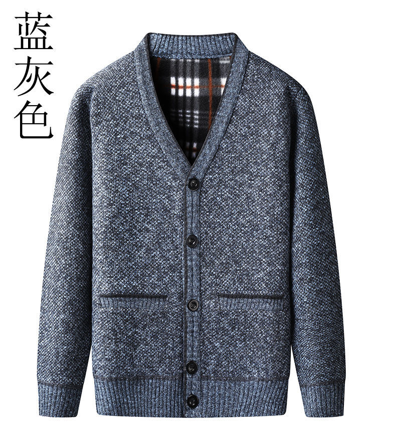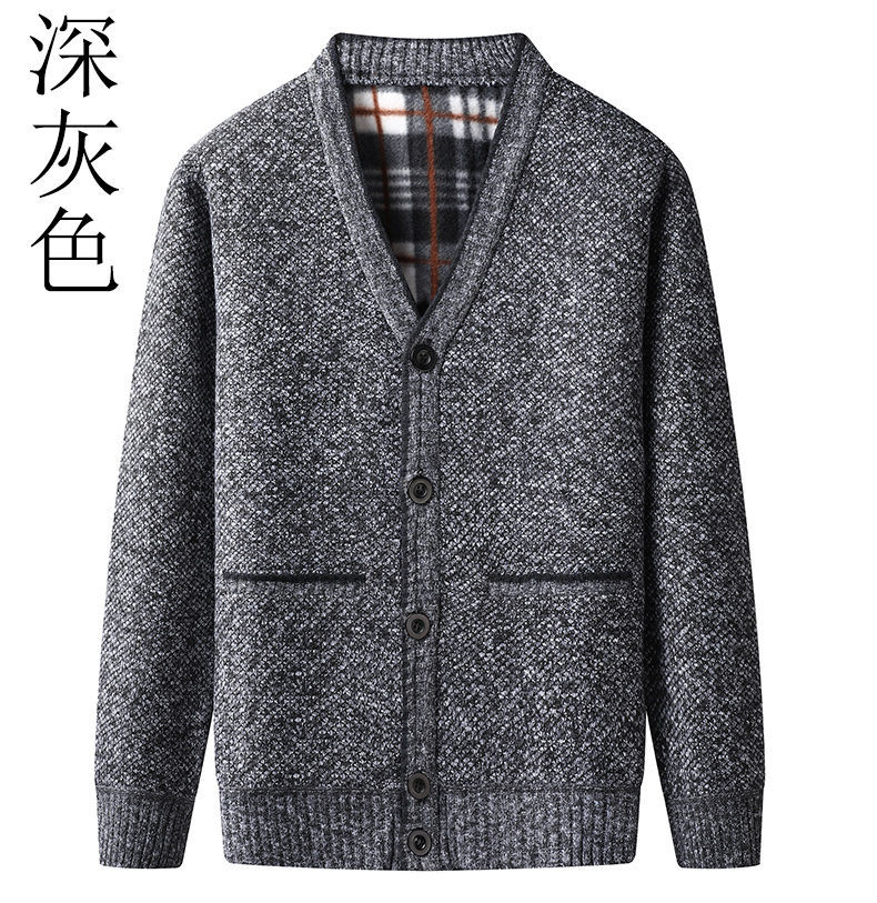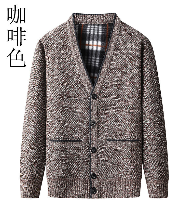 一件代发 冬季中年男加绒毛衣开衫 加厚V领中老年爸爸装针织外套
