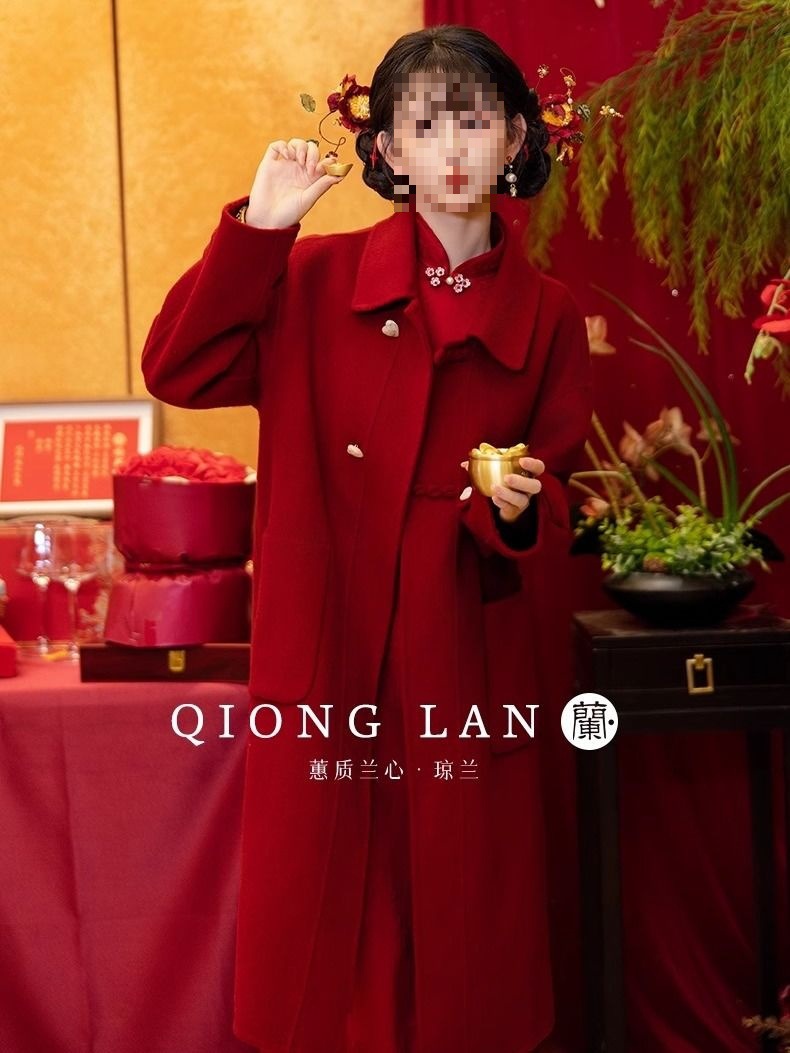 両面ウールコート 2025 秋冬新作レッド中国風ロングレトロウェディングウールジャケット