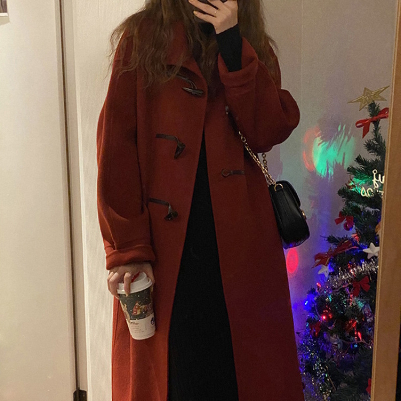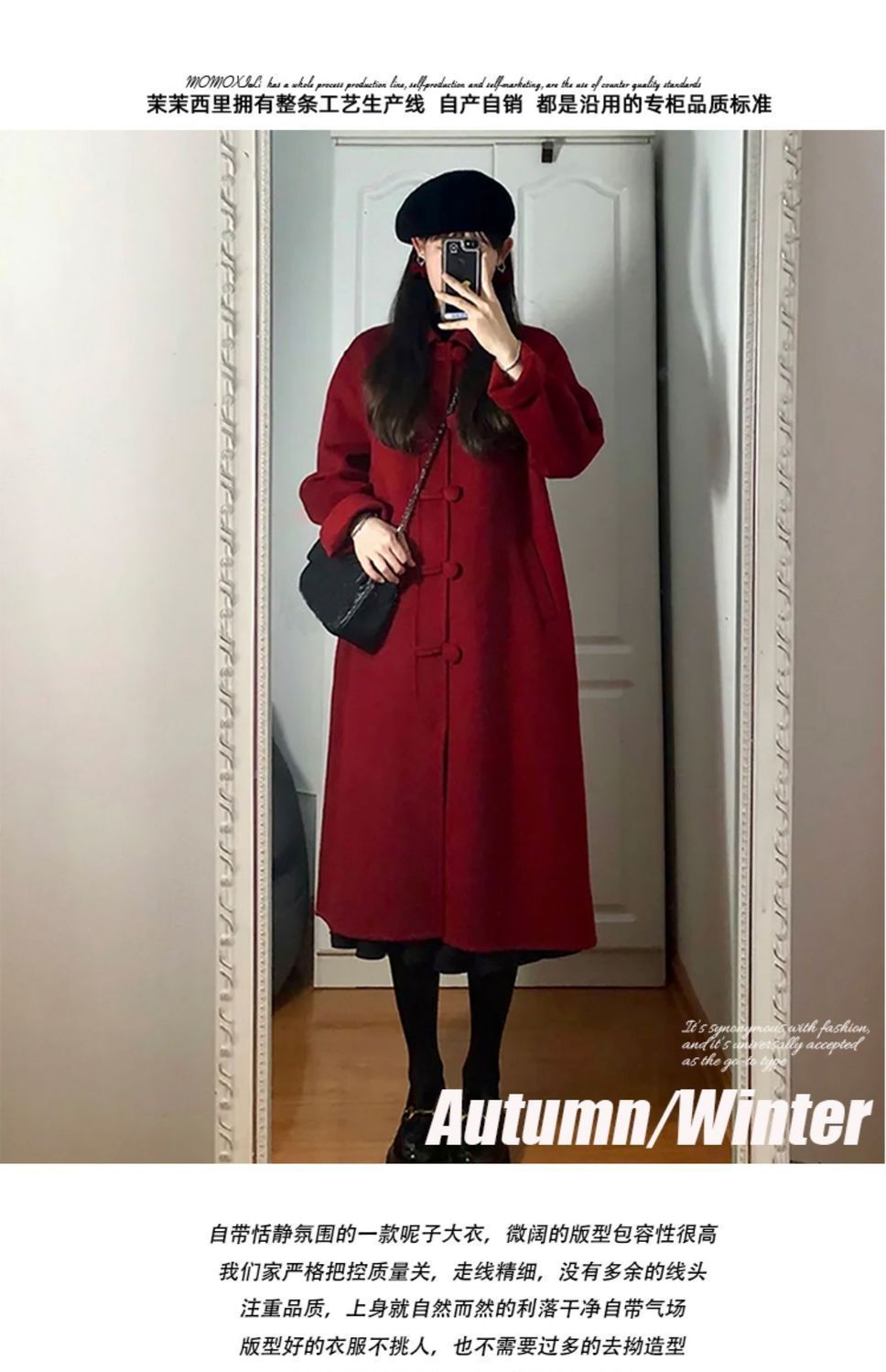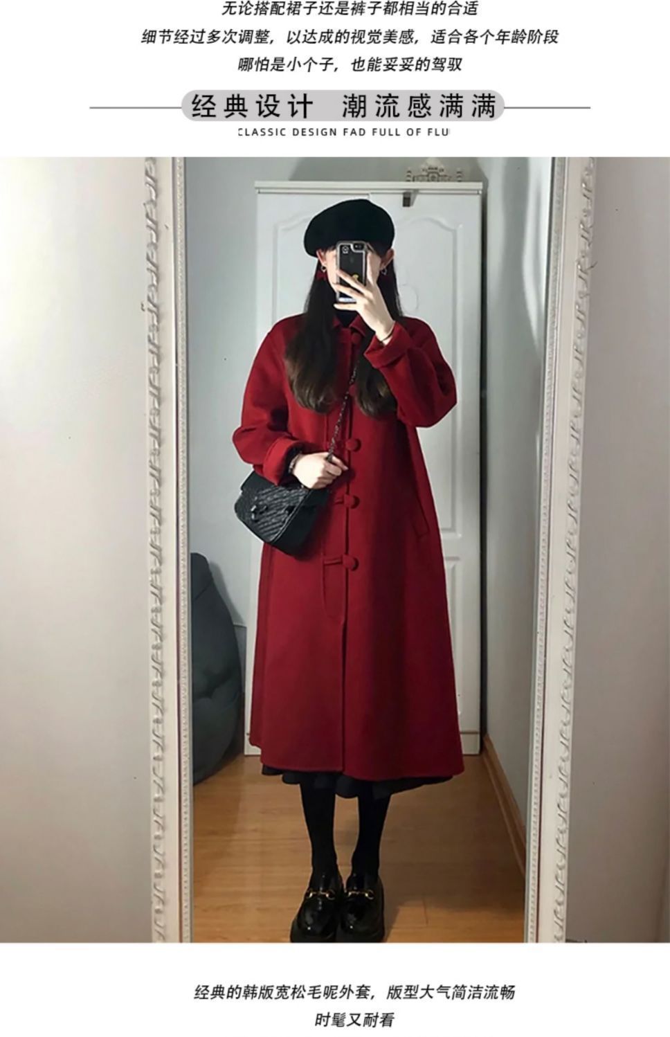 レトロな赤色の両面ウールコート、女性用、ボタン留め、ミドル丈、2025秋冬新作、厚手のウール混紡コート