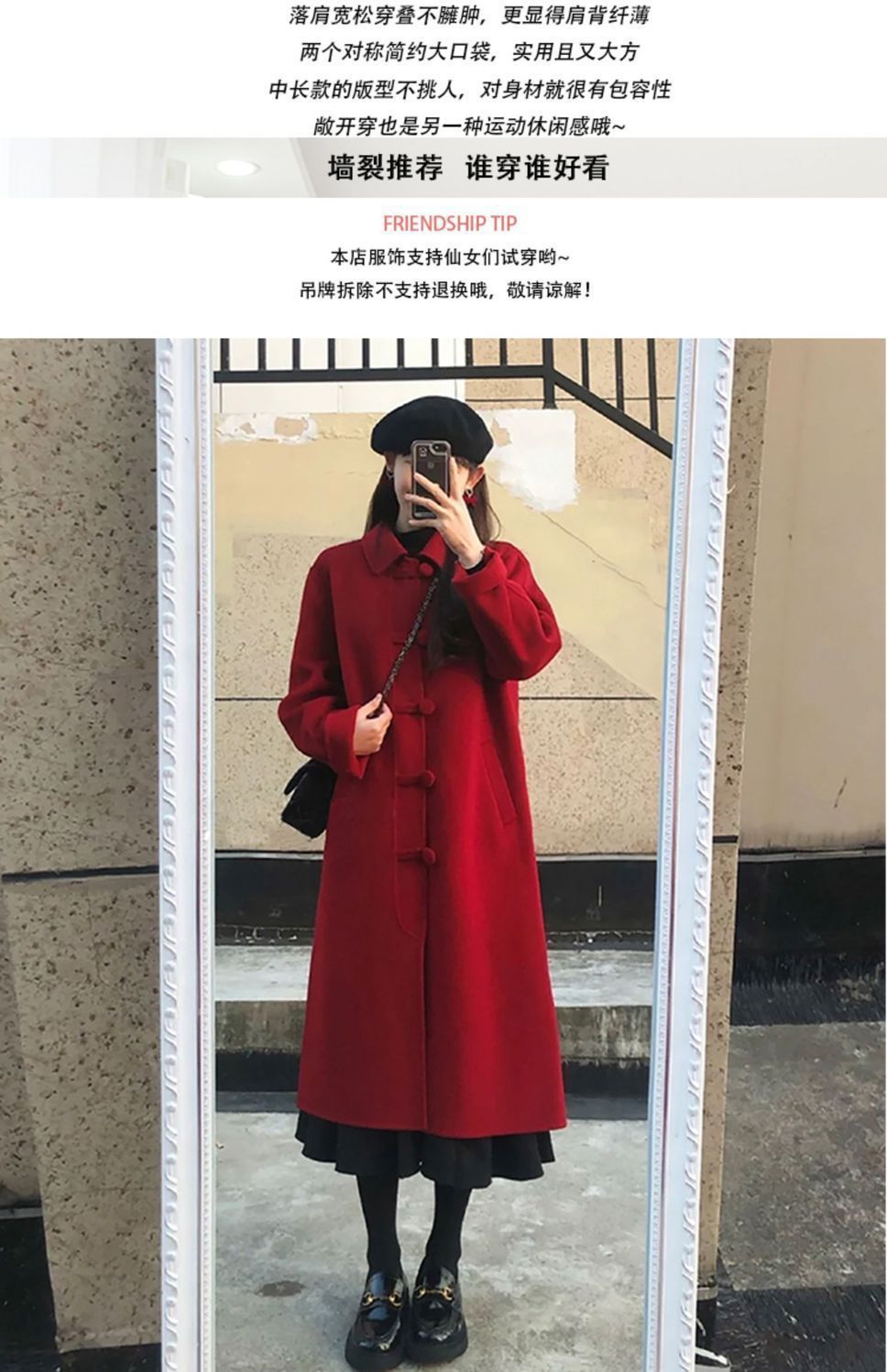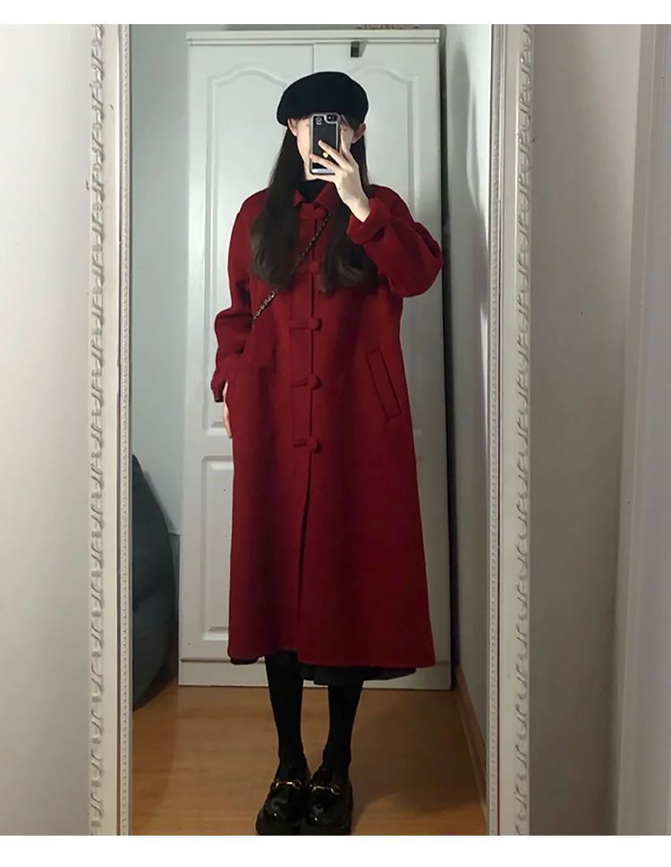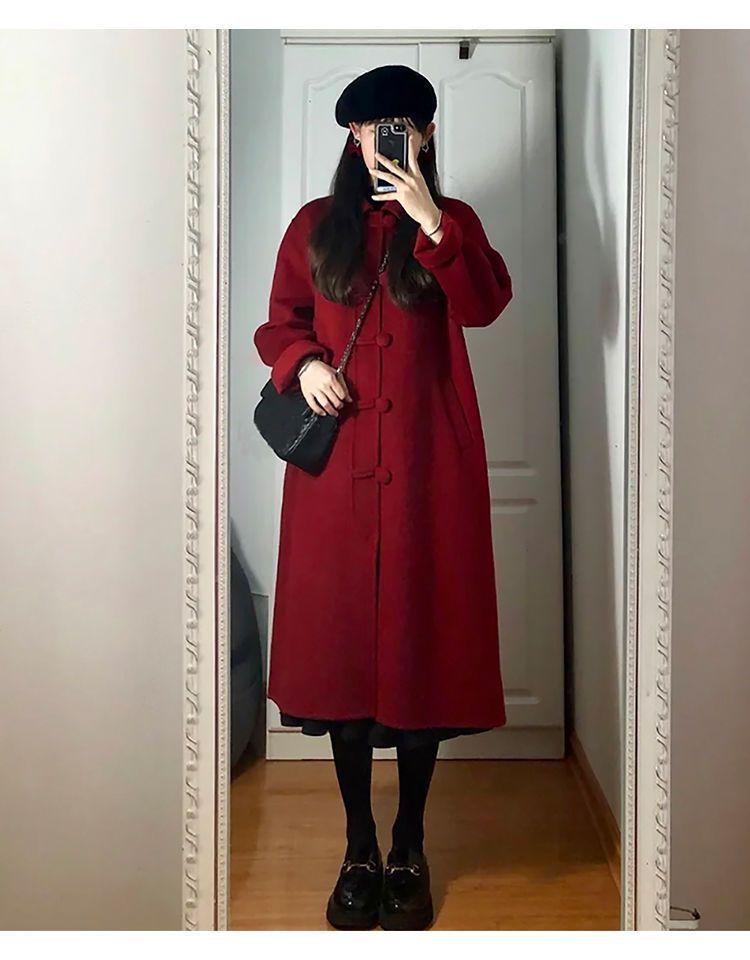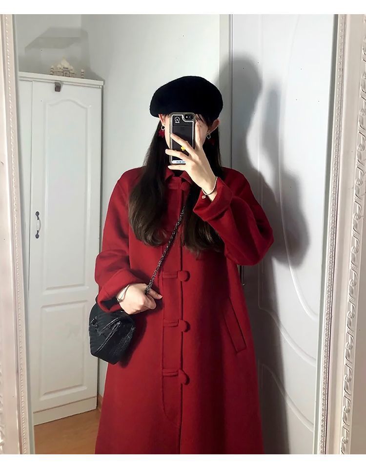 レッドの中国風両面カシミヤコート レディース 2025秋冬新作 結婚式のお祝いに最適なミドル丈ウールコート 厚手