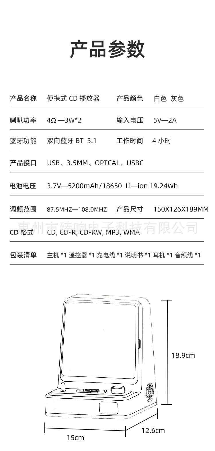 蓝牙:BT5.1(名称:CDplayer)
