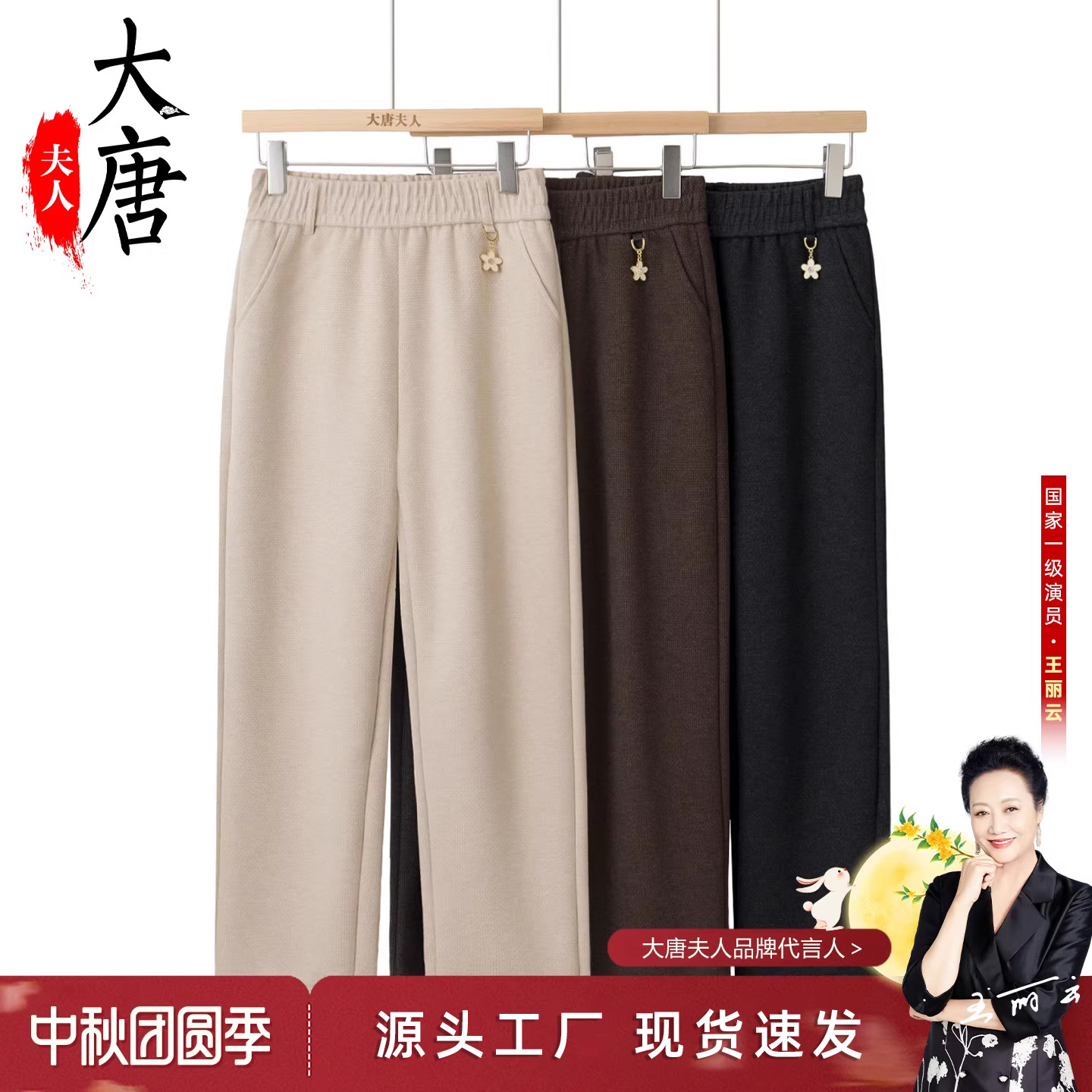 大唐夫人中老年人裤子奶奶小白花休闲裤松紧腰带妈妈纯色秋长裤