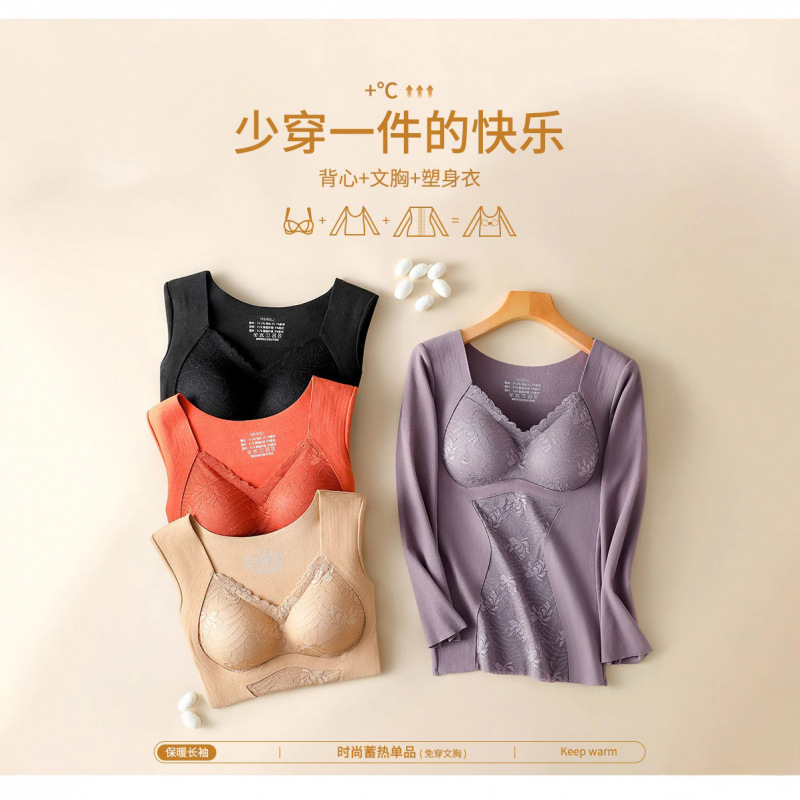 秋冬缎面蕾丝保暖内衣一体式固定杯发热背心女简约百搭磨毛美背
