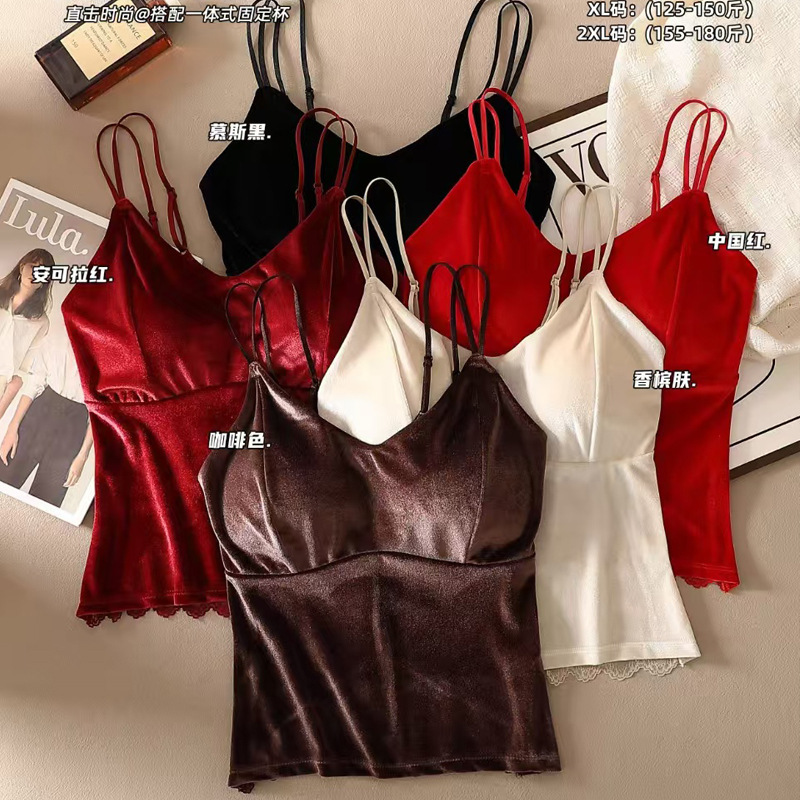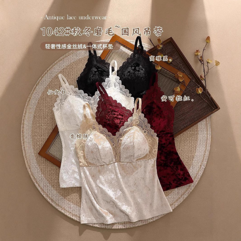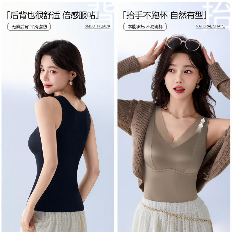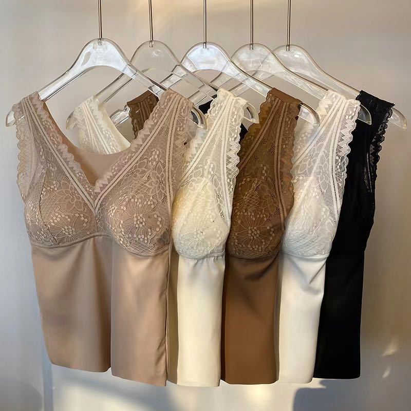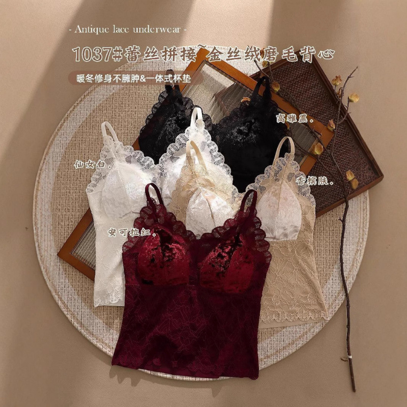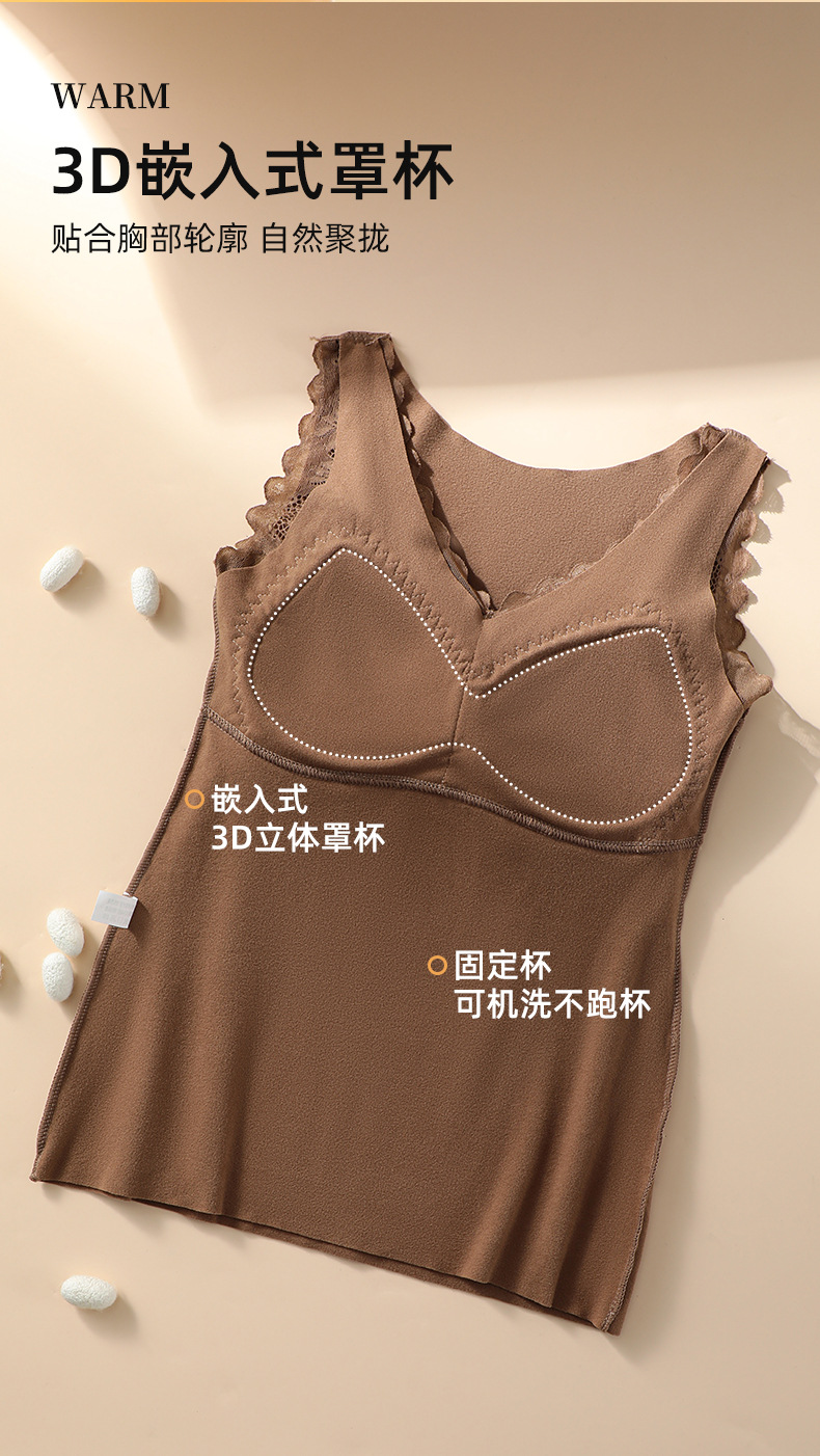 轻奢蕾丝缎面德绒磨毛保暖背心无痕加厚带固定胸垫内搭打底女
