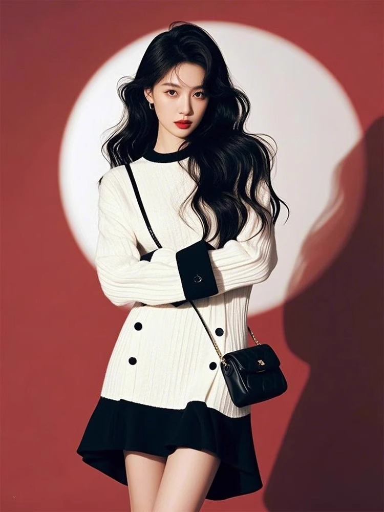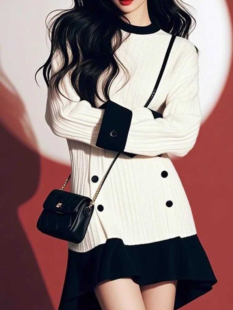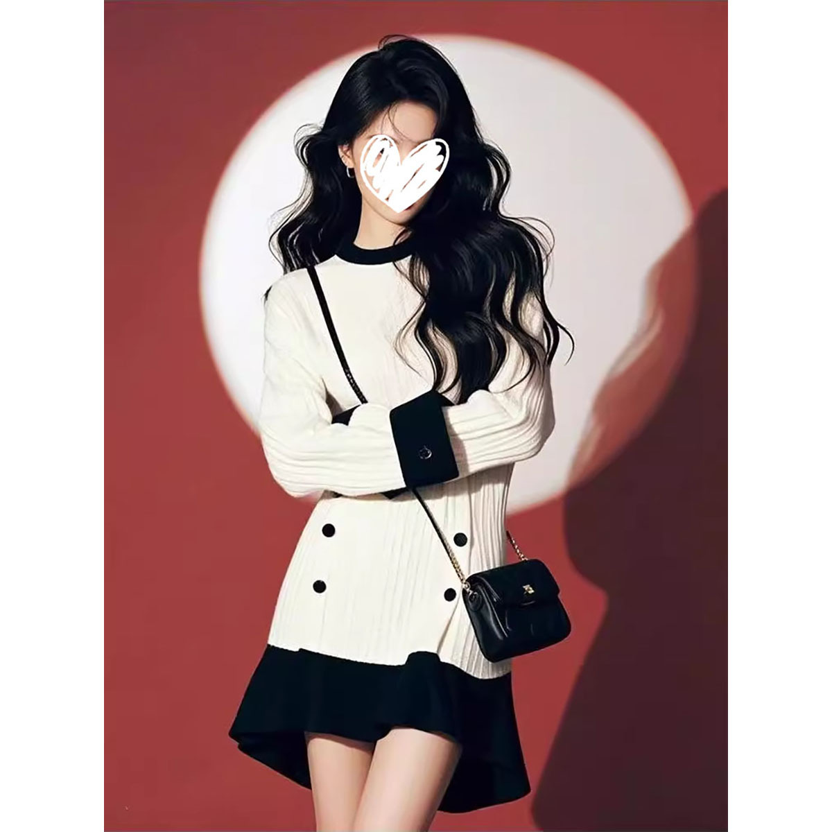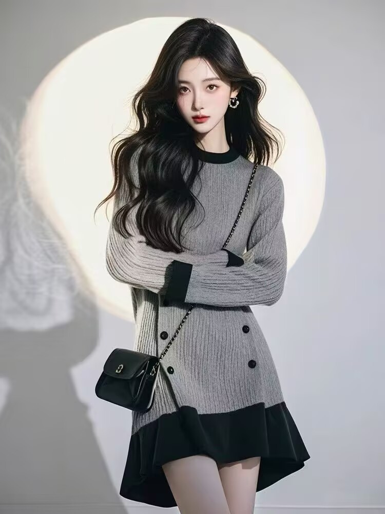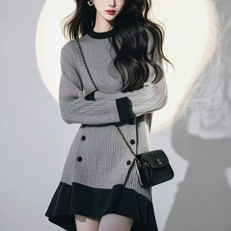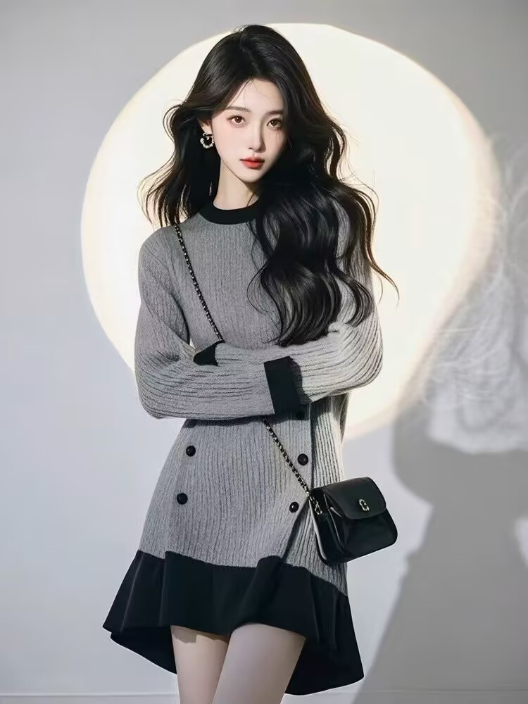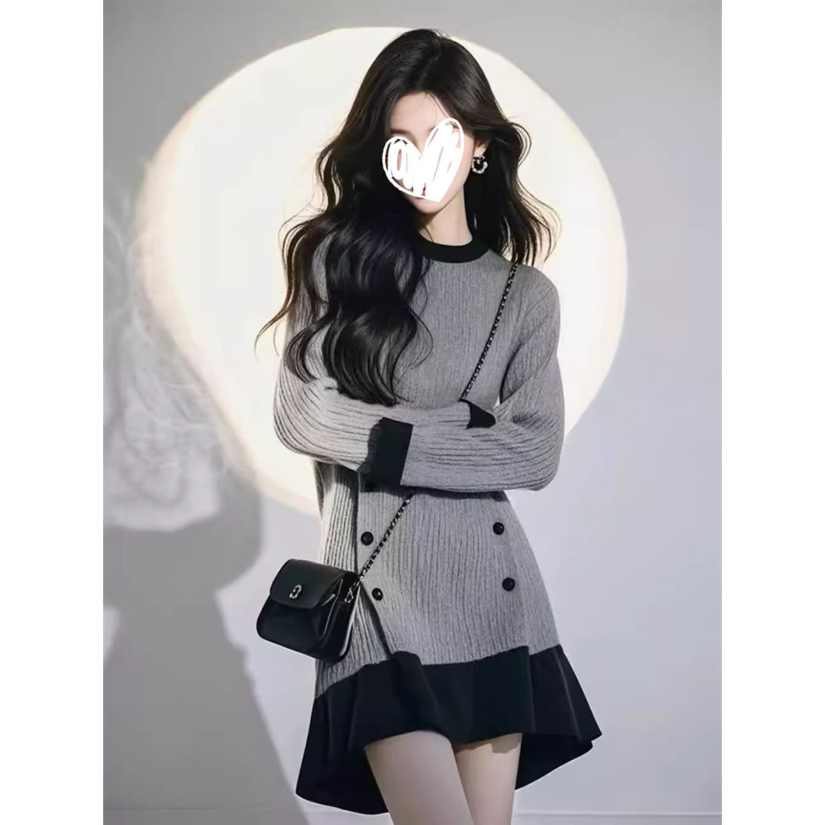 高级感撞色圆领长袖针织连衣裙女秋冬季新款宽松慵懒风显瘦毛衣