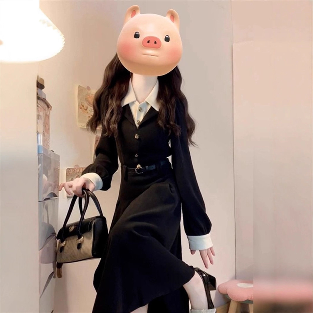 黑色假两件连衣裙子女秋冬季2025新款高级感教资面试通勤气质长裙