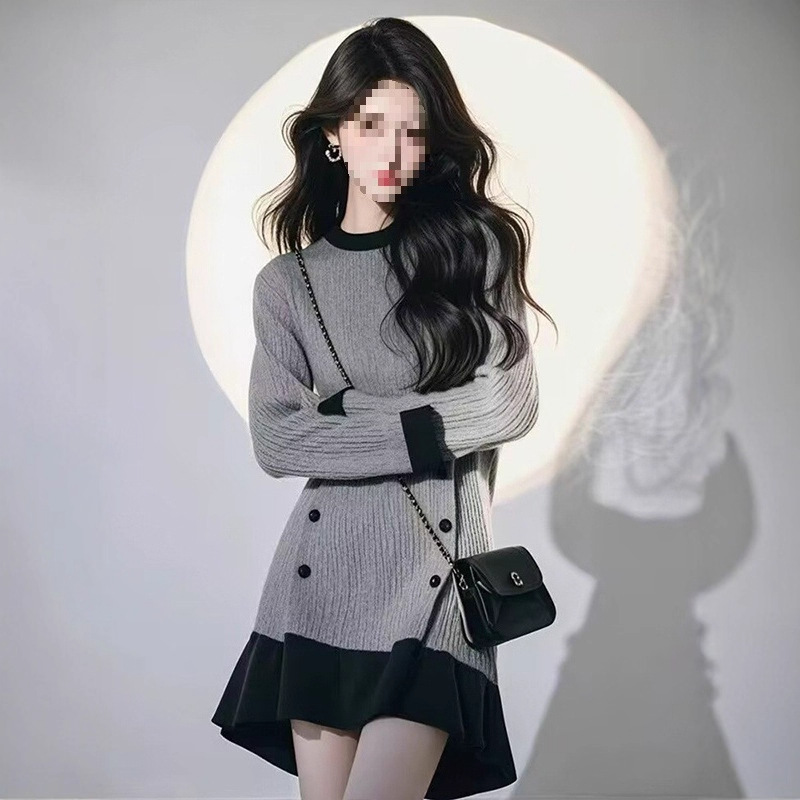 大码胖撞色圆领长袖针织连衣裙女春新款宽松慵懒风显瘦毛衣短裙