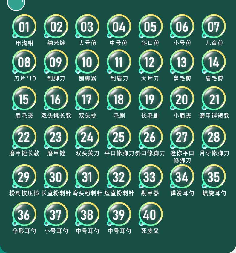 新型爪切りセット、フルセット、鷹嘴型プライヤー、ダークグリーン、35点セット、爪切り、甘皮切り、マニキュアセット