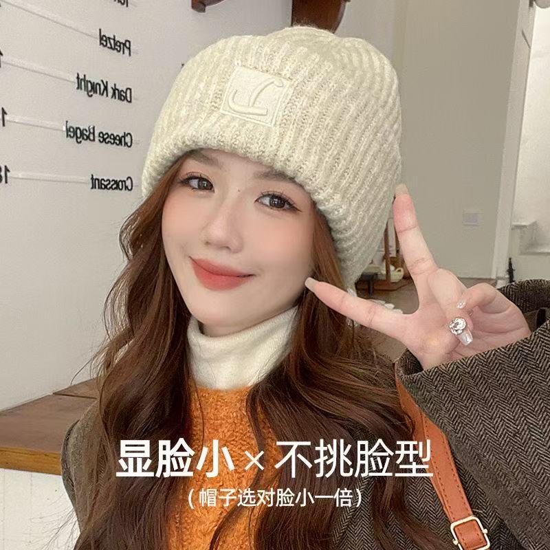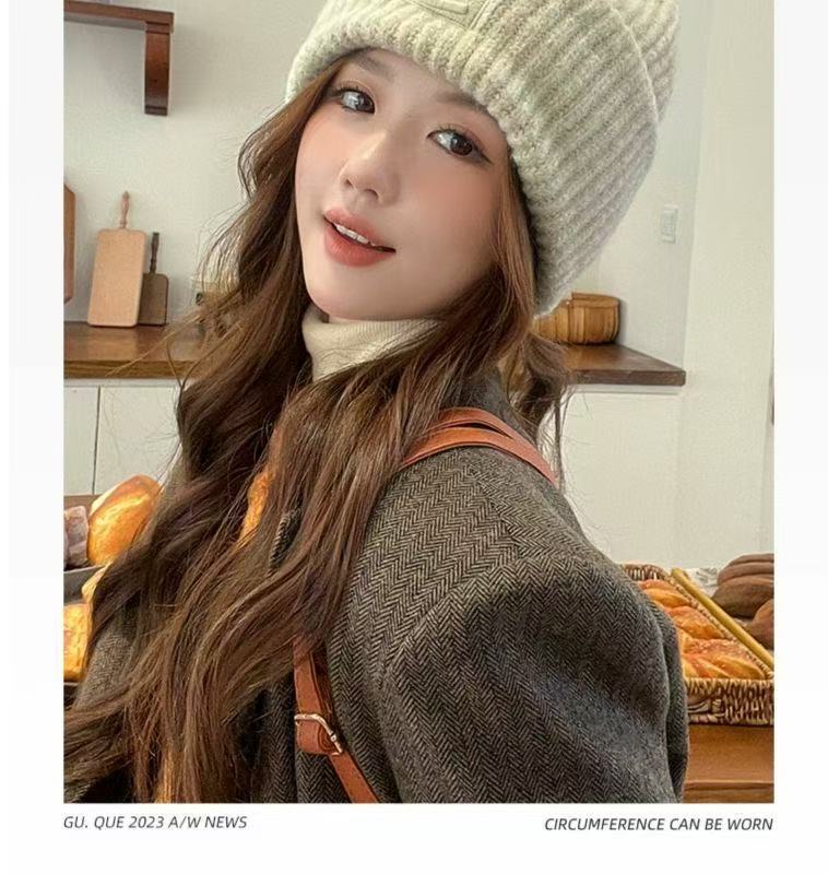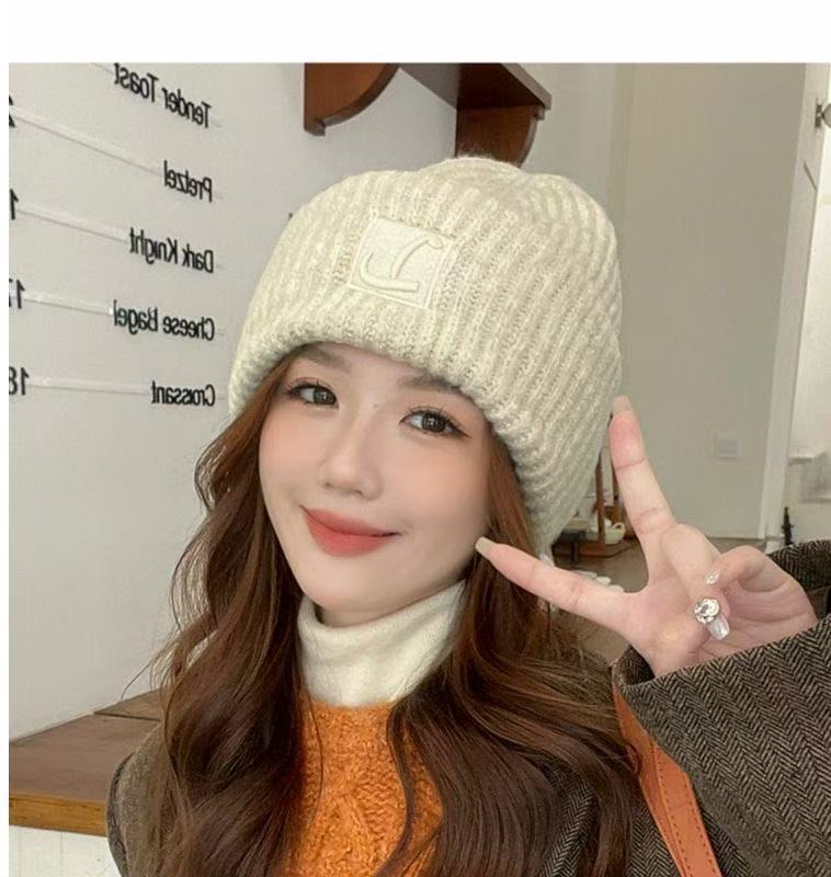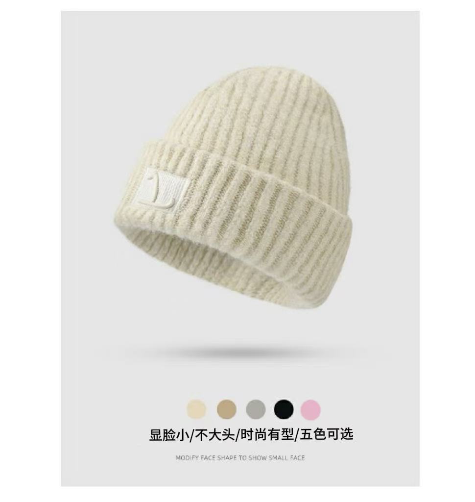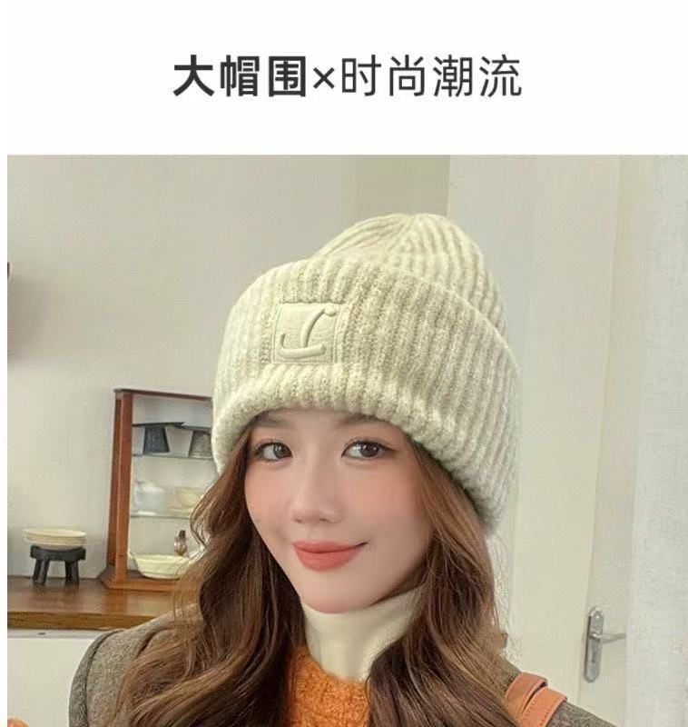 新款L标针织帽子女大头保暖宽松堆堆帽大脸显脸小护耳毛线潮帽女