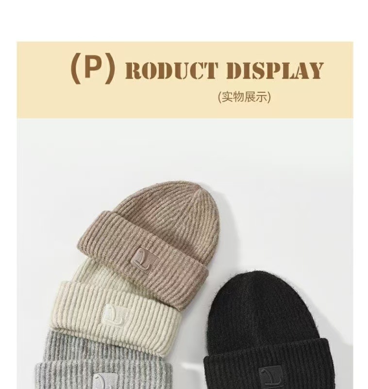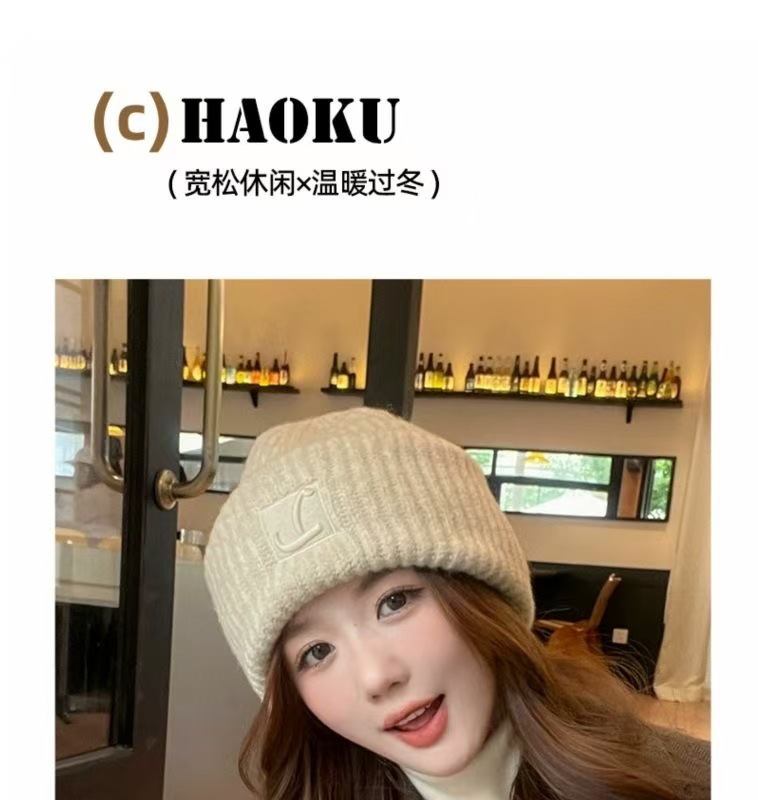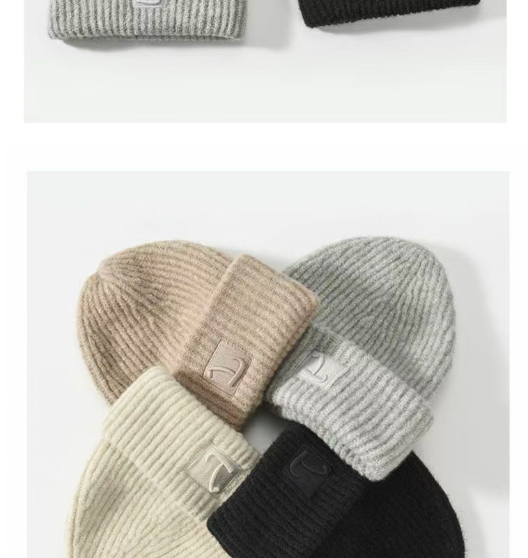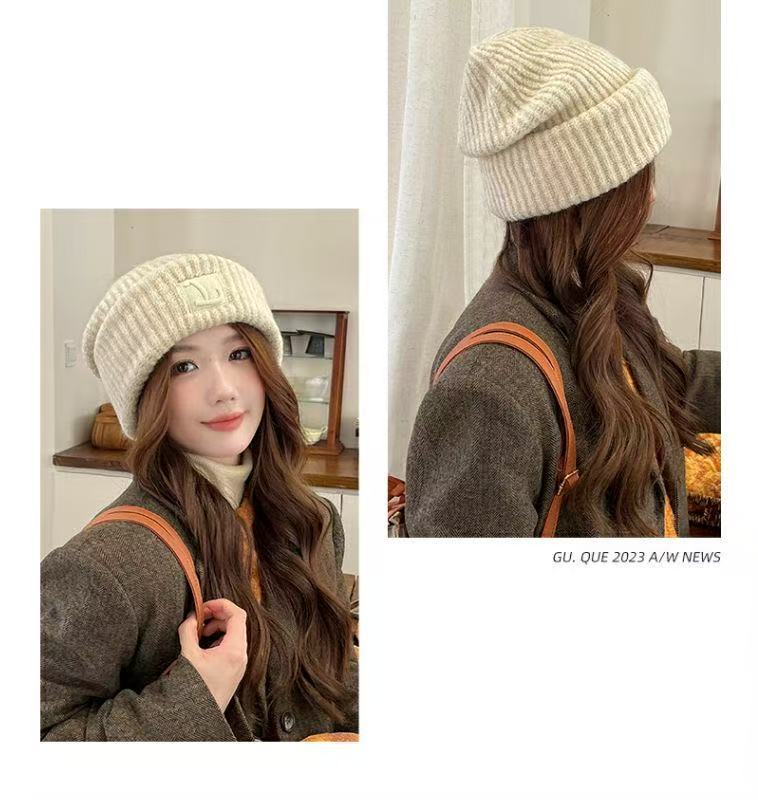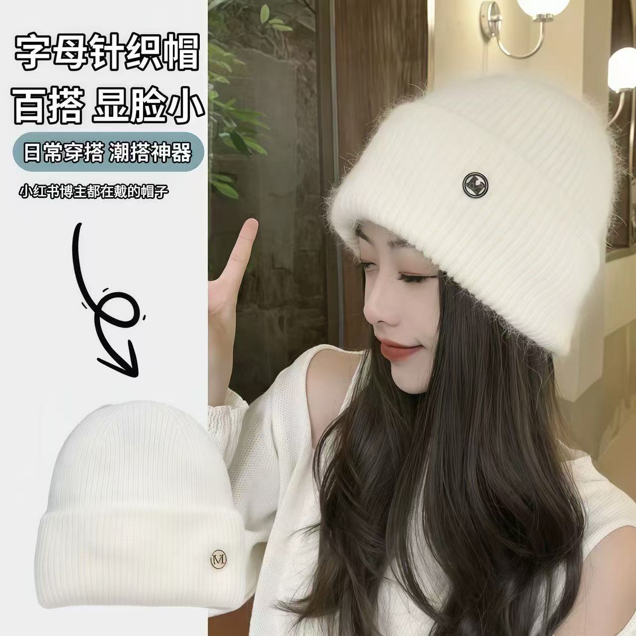 新款L标针织帽子女大头保暖宽松堆堆帽大脸显脸小护耳毛线潮帽女