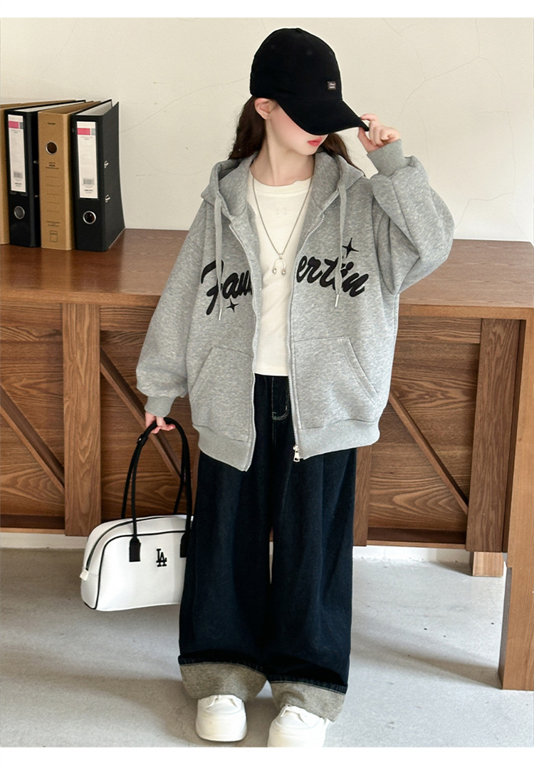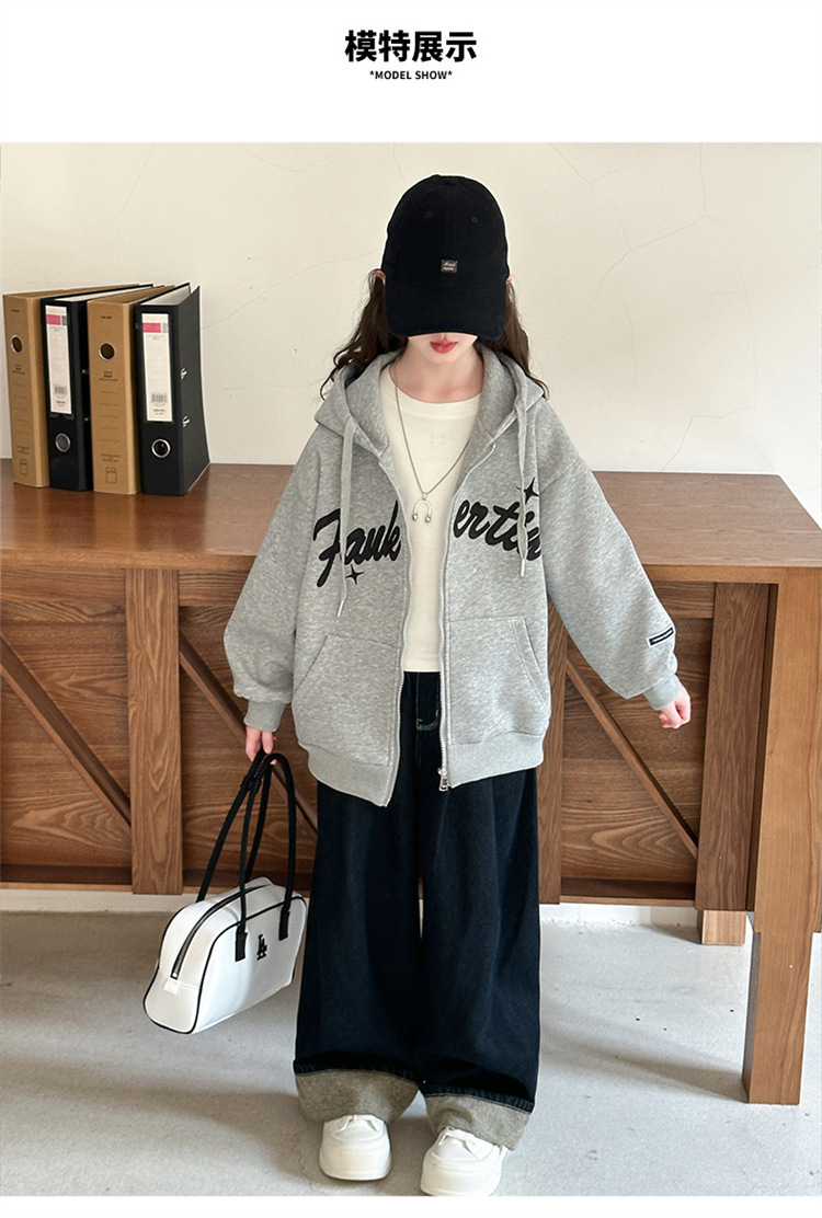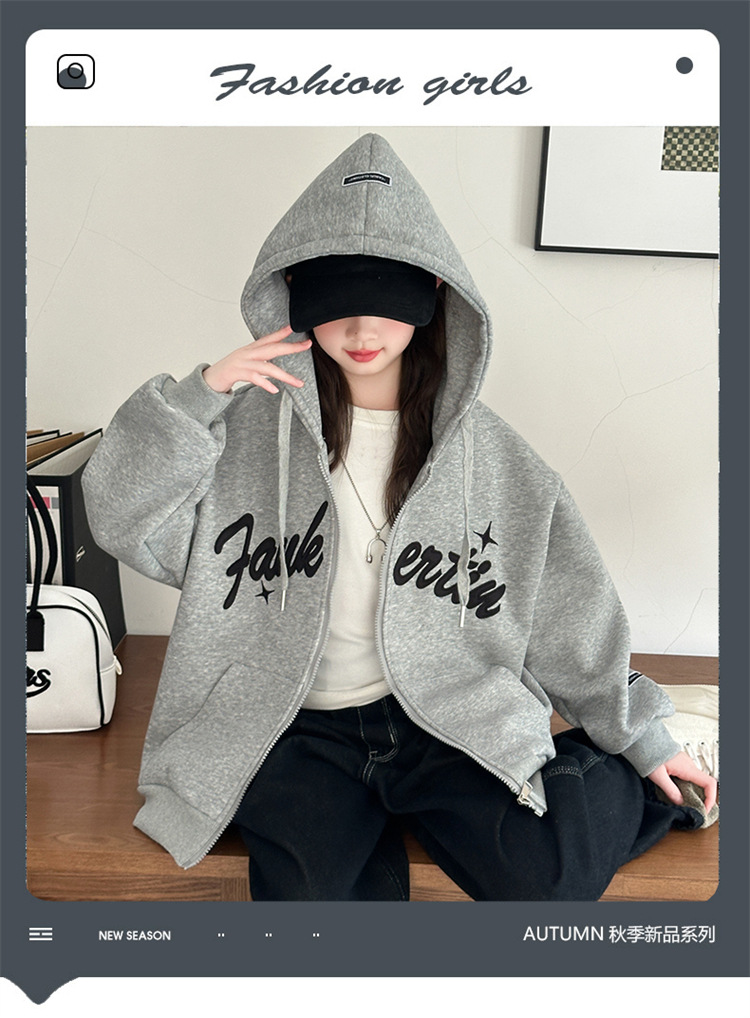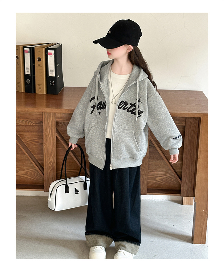 女童外套2025年秋季新款字母刺绣连帽拉链衫中大童宽松长袖上衣潮