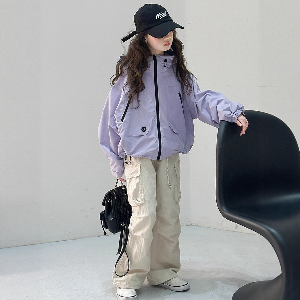 女童短款冲锋衣外套2025秋装新款大童时髦洋气连帽百搭拉链衫风衣