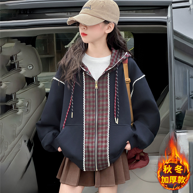 女童外套秋冬季2025新款中大童时尚洋气韩系格子拼接连帽抽绳外套