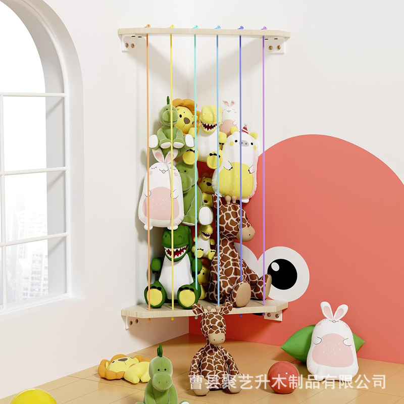 木製の壁収納整理棚カラー弾性ロープ付き、人形収納棚、長さ調節可能なおもちゃネット棚