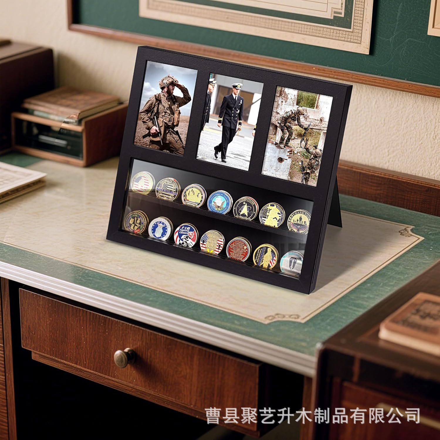 木製コインディスプレイボックスチャレンジコインホルダー木製メダルポーカーチップ壁装飾収納ボックスフォトフレーム付き