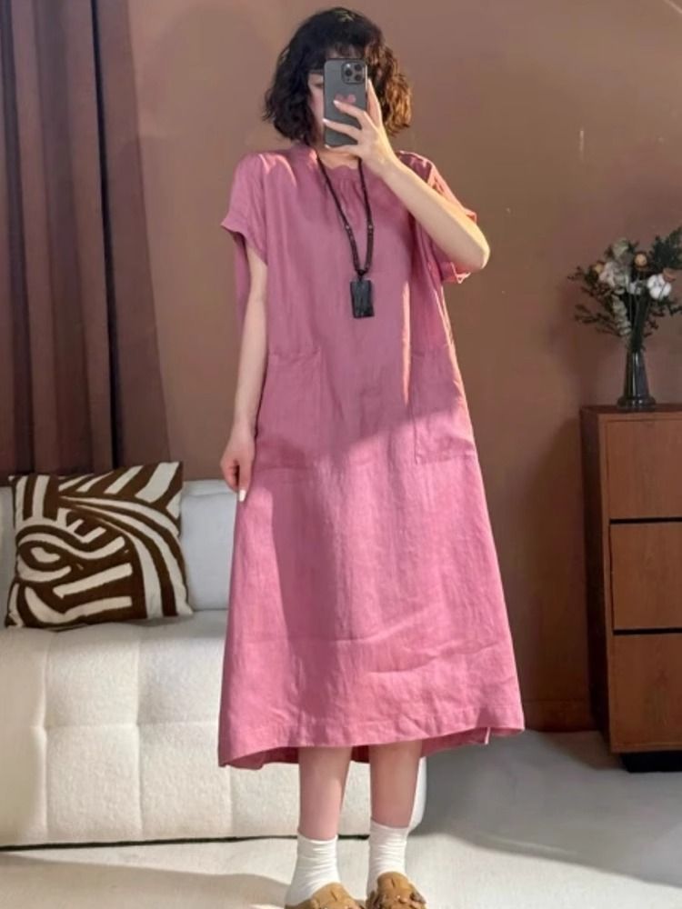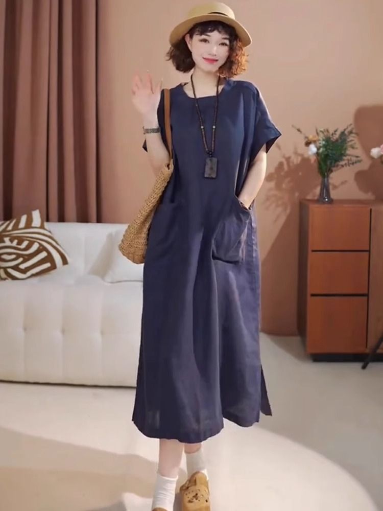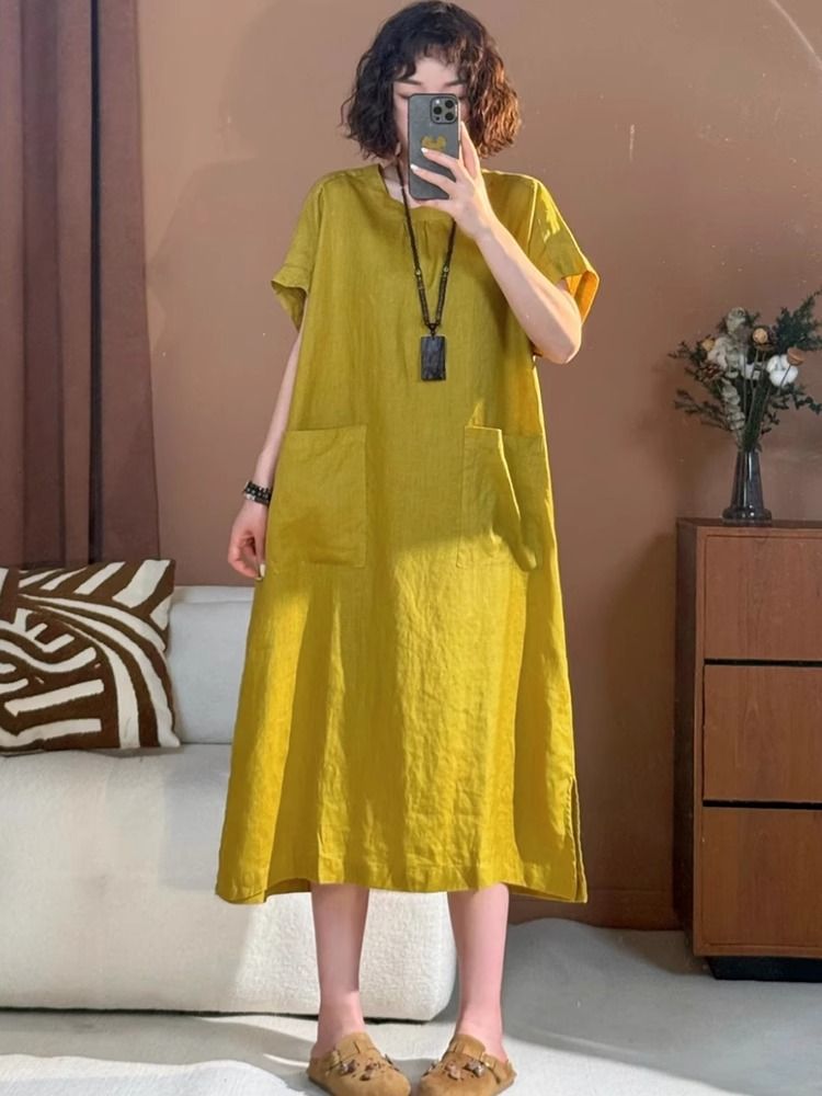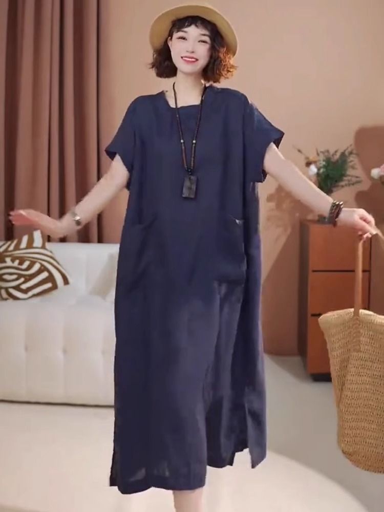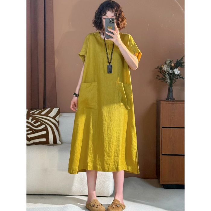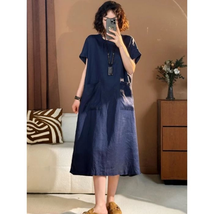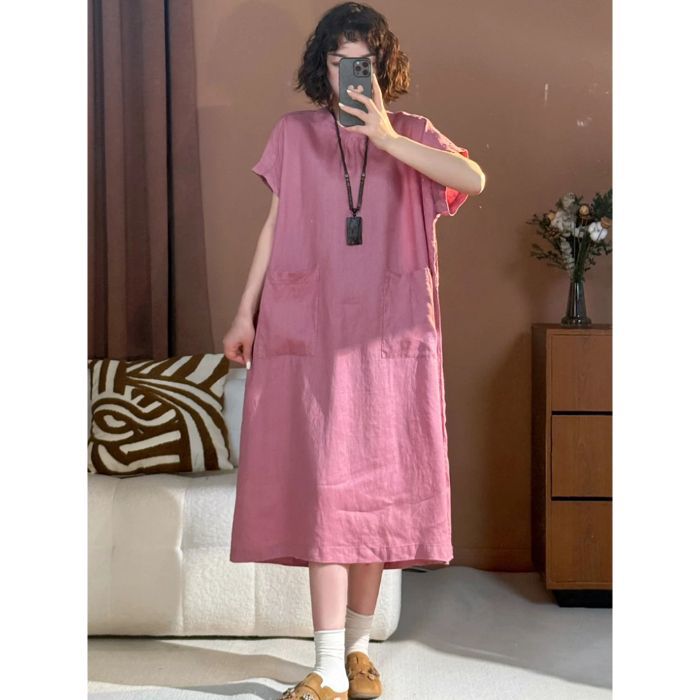 宽松口袋设计棉麻连衣裙女装2025夏季新款中长款显瘦大码圆领短袖