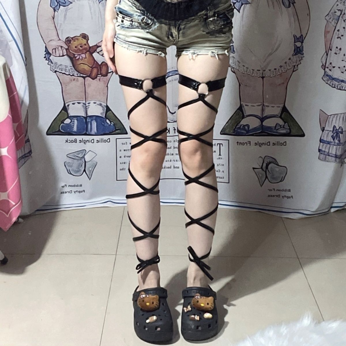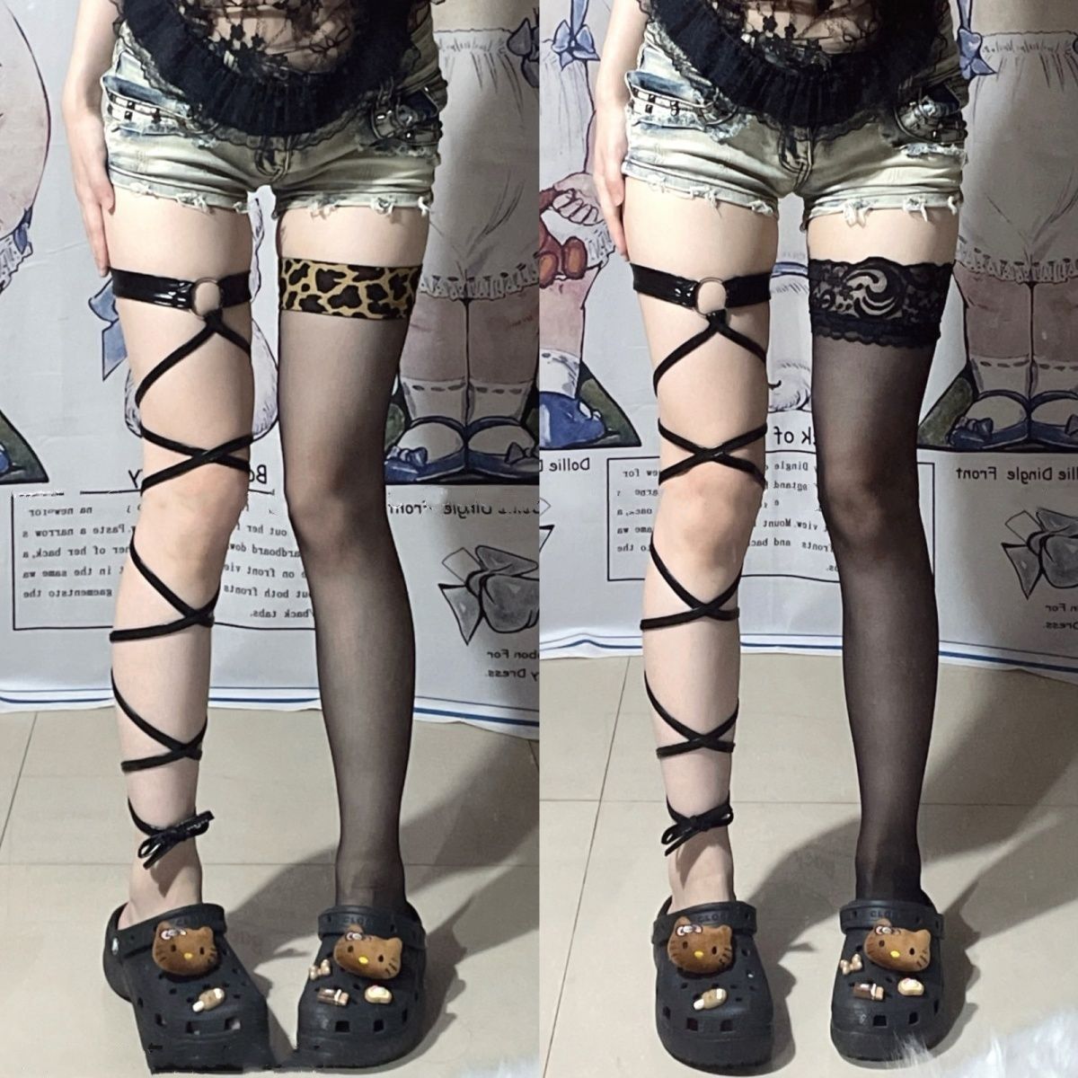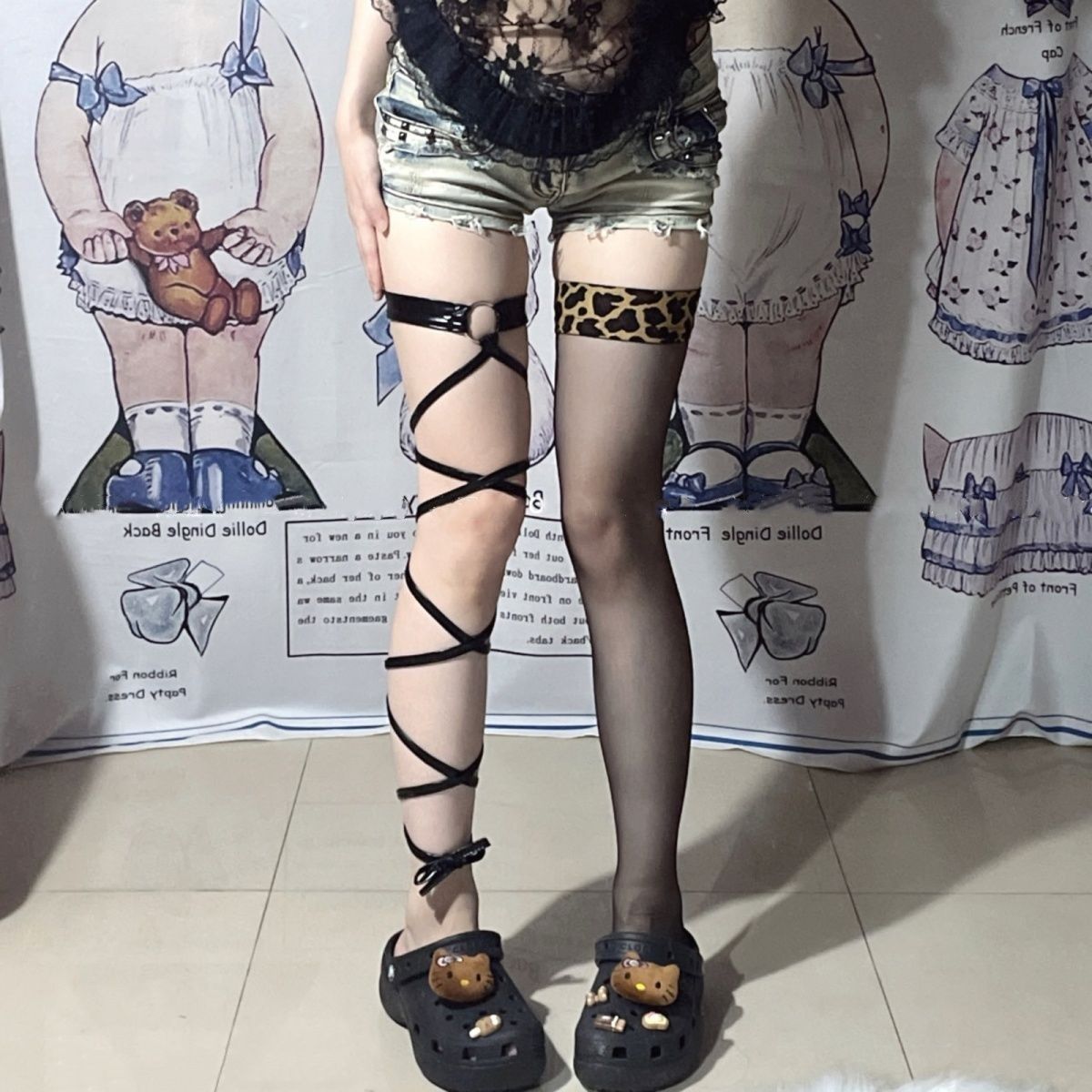 豹纹图案长筒袜搭配百搭腿套新款高颜值辣妹纯欲风交叉绑带大腿环