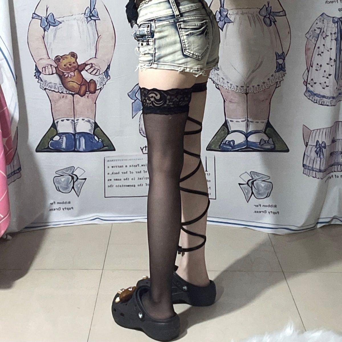 颜色 豹纹过膝袜搭配交叉绑带袜,朋克亮黑色绑带腿环2只,朋克亮黑色绑带腿环1只,黑色豹纹图案袜子1双,蕾丝过膝丝袜-1双装黑