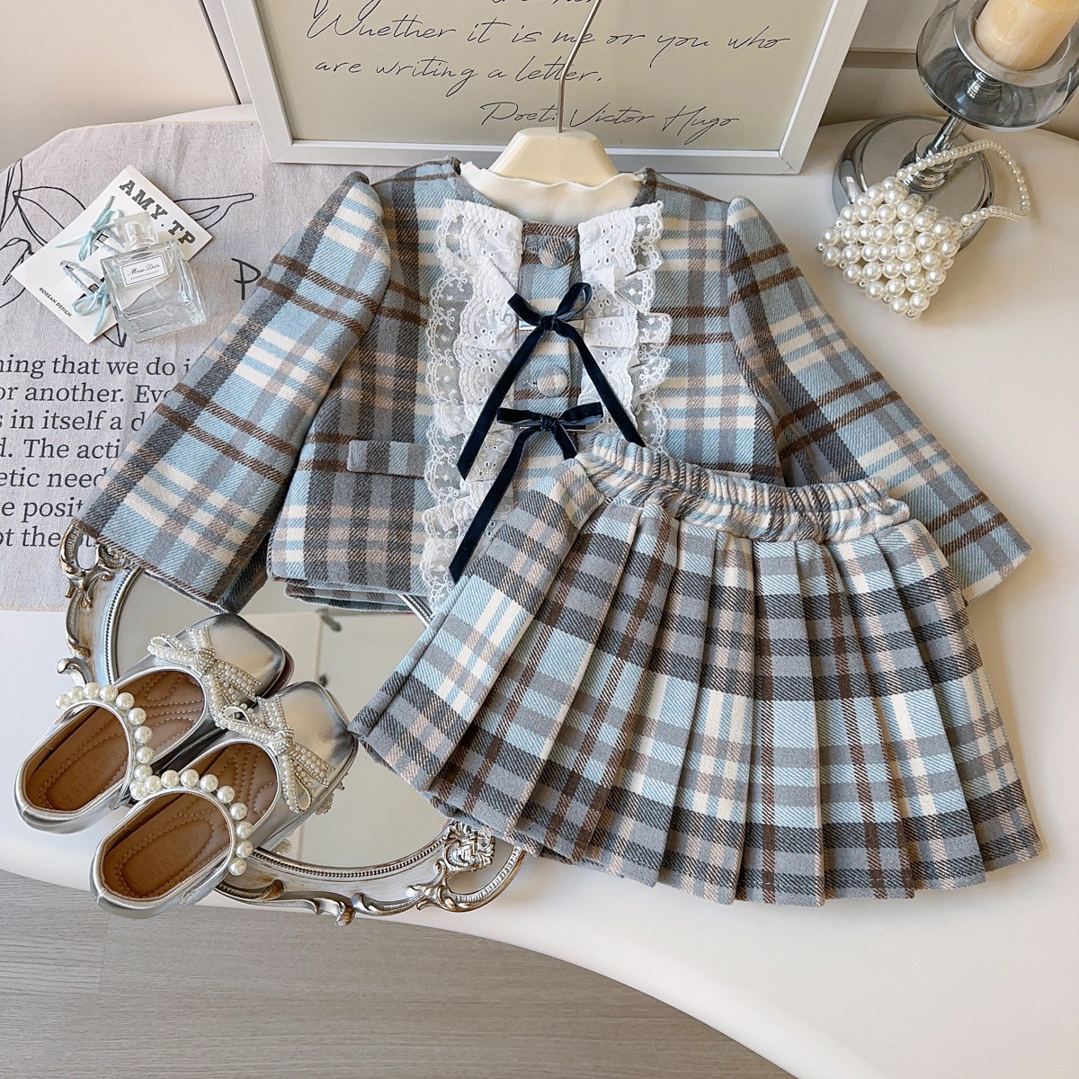 春の女の子用子供服セット、おしゃれな小香風服、メッシュ素材の子供用ジャケットとプリーツスカートのツーピースセット