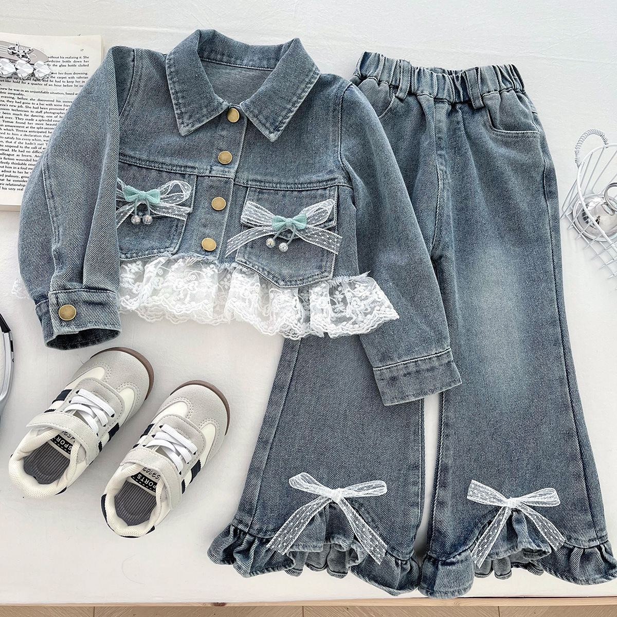 2025年秋新作 韓国風女の子スーツ エレガントなシャツ リボン付きデニムパンツ ベスト 子供用3点セット