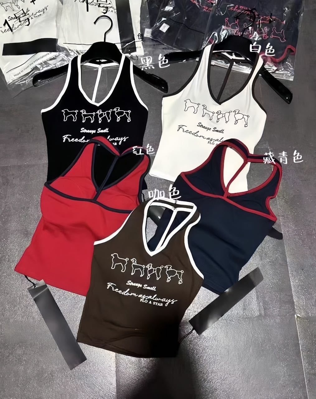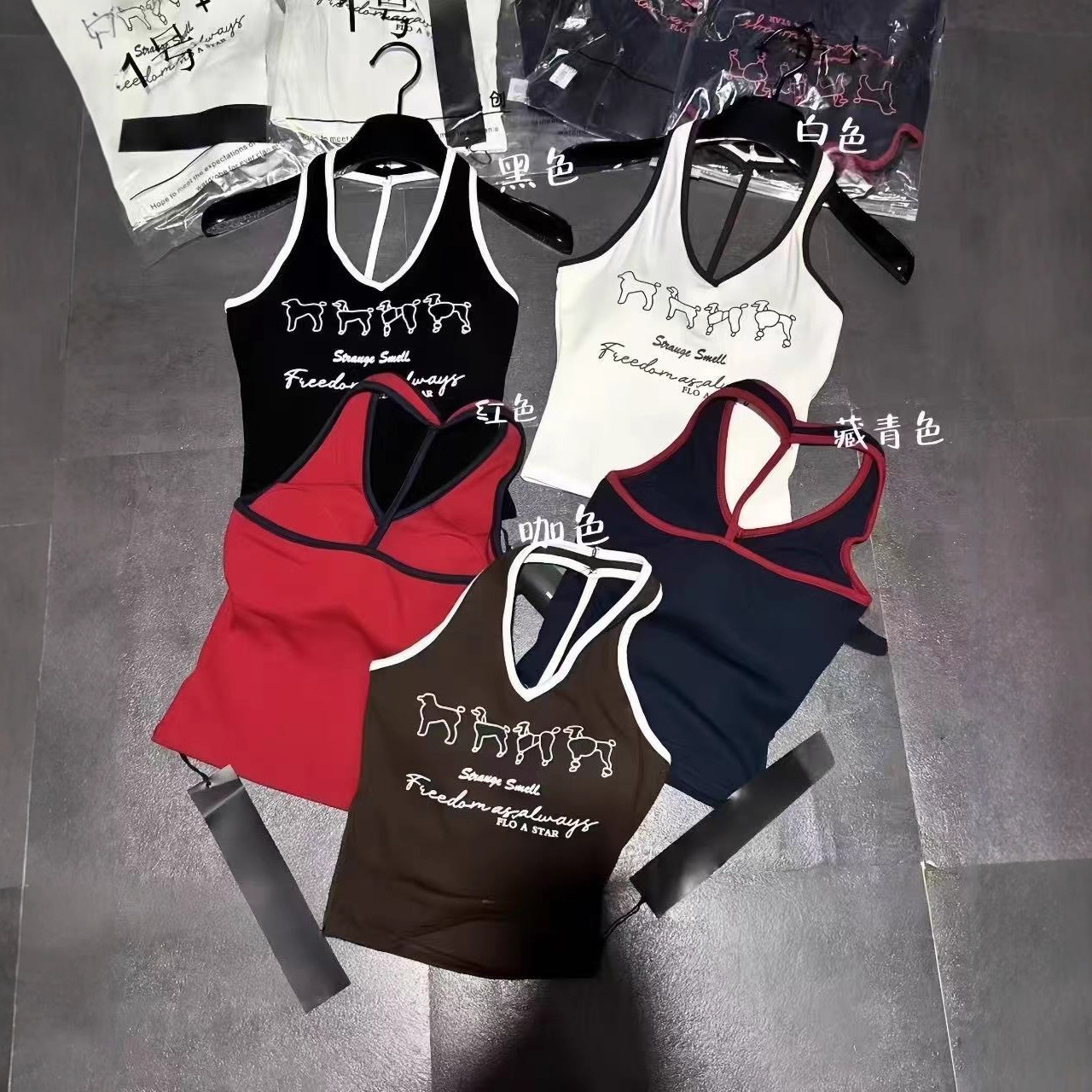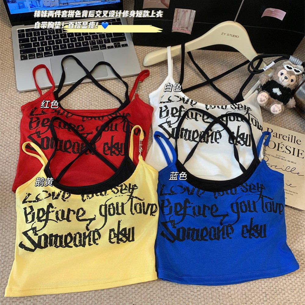 夏季新款辣妹绑带字母印花短款吊带设计感带胸垫修身挂脖裹胸背心