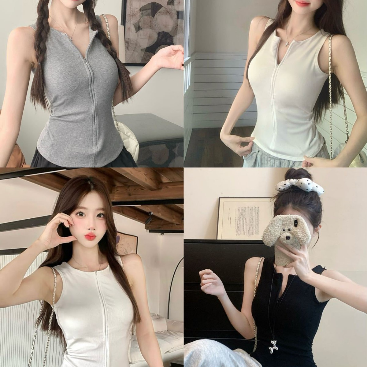 66042#2025辣妹圆领拉链无袖吊带背心女收腰修身上衣外穿磨毛