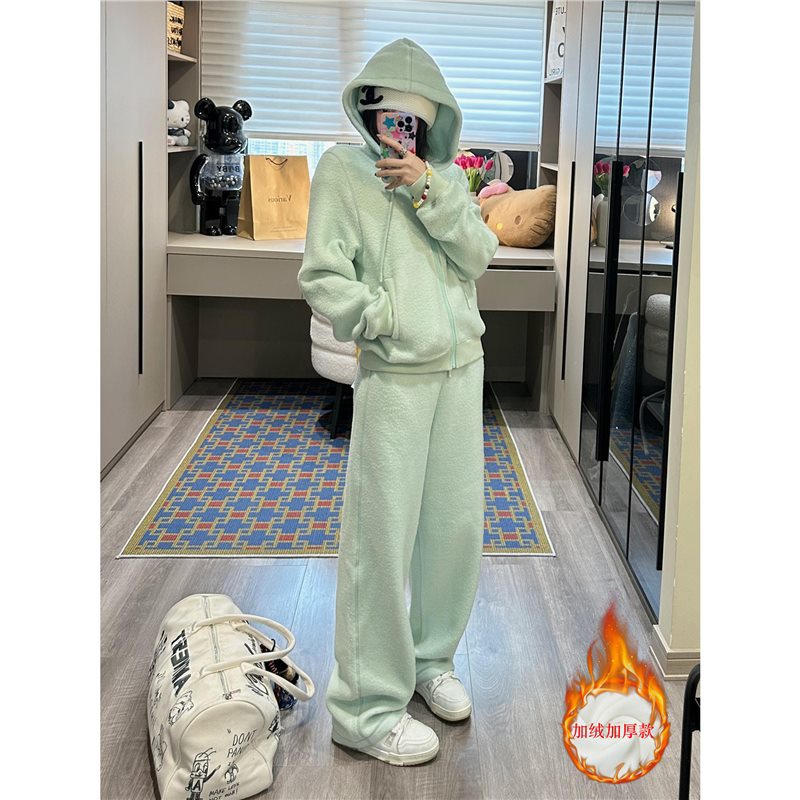 高级感网红秋冬加绒加厚卫衣套装女休闲摇粒绒运动服两件套慵懒风
