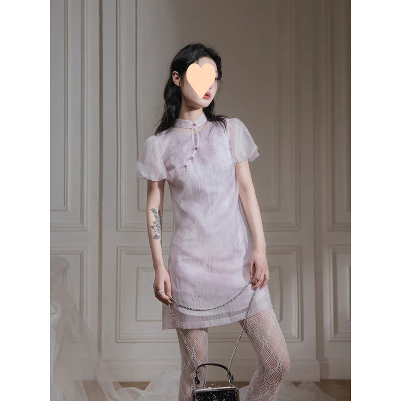 新しい中国風の椿ライトピンクの2ピースドレス、人気の夏の国民風パフスリーブチャイナドレスクリアランス