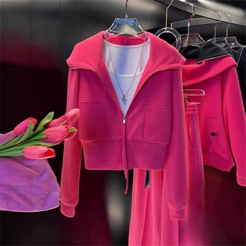 南油玫红色运动套装女春秋季新款设计感翻领拉链卫衣阔腿裤两件套