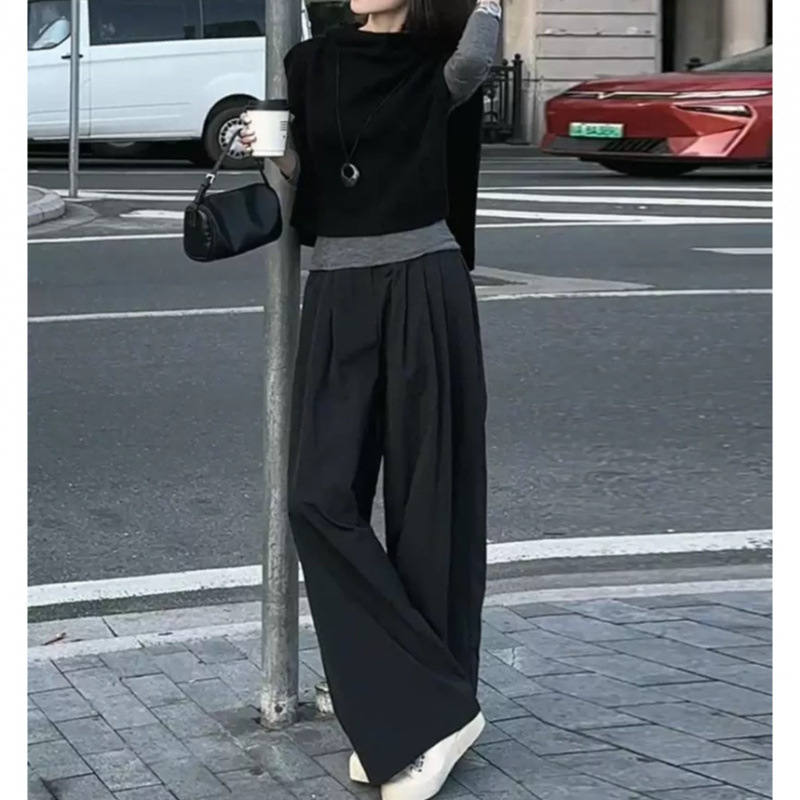 秋になると、黒いベストグレーの長袖の広いズボンの2つのセットを着ています。