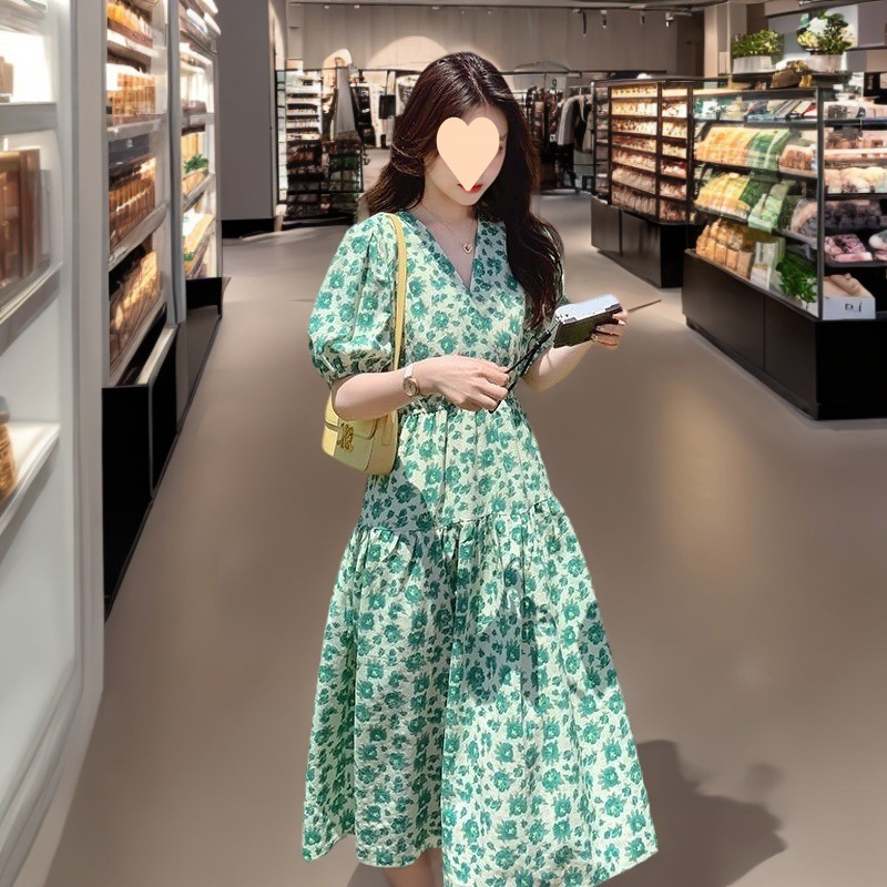グリーン小花柄ドレス 2025 夏ウエスト痩身フレンチ優しく甘いパフスリーブ襟ロングスカート